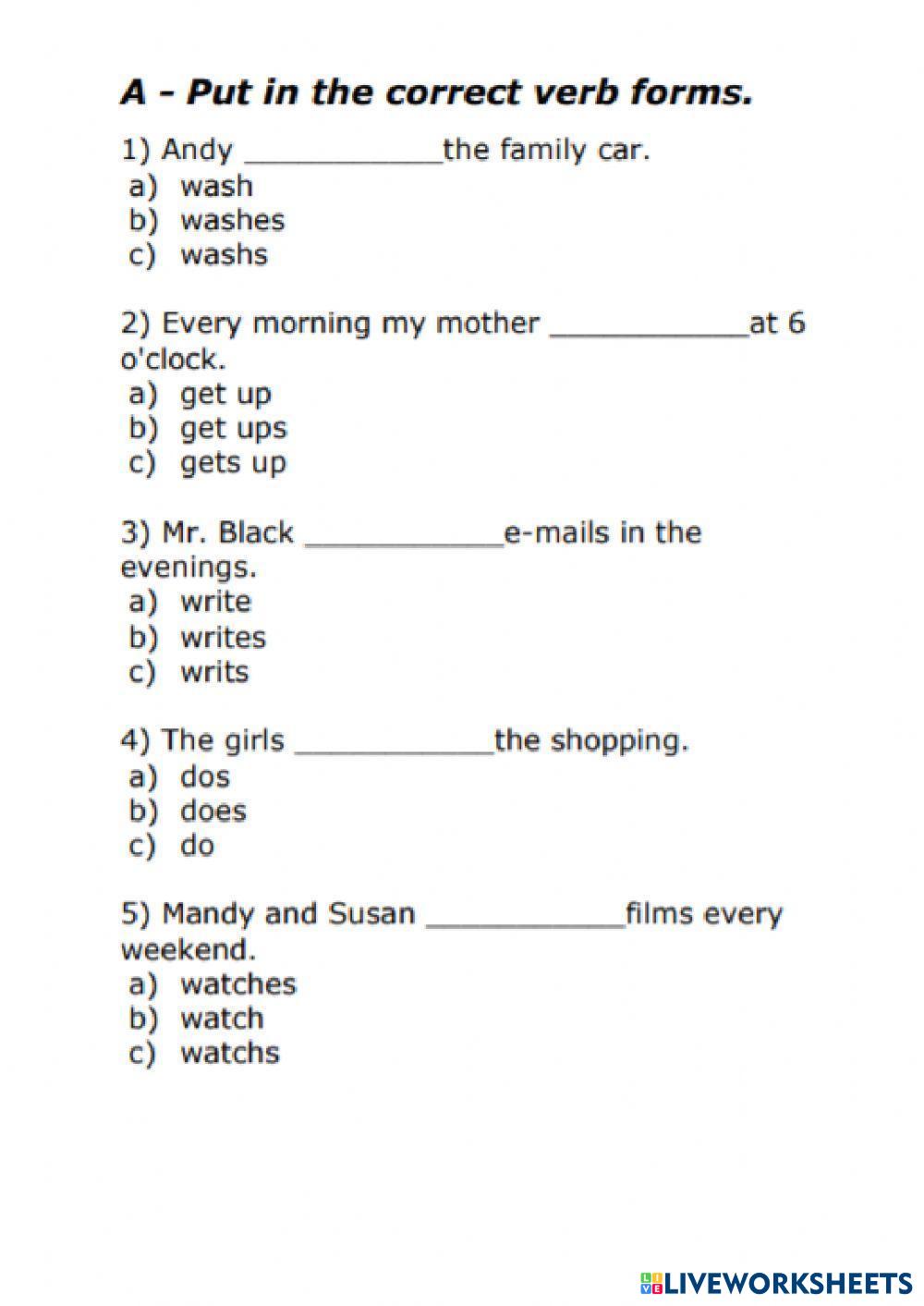 Created byDaniel Antonio Juárez Duarte Verb forms Verbs Age 17+ level: A1 English Author's Instructions My Google Classroom Courses × 0 classes selected (0 students total) Quick Access Select all classes (0 classes) All Classes Loading courses... Cancel Share Share to selected Course __COURSE_NAME__ __STUDENT_NAME__ (__STUDENT_EMAIL__) Worksheet 1 Download Worksheet Validation Check my answers Emails my answers to my teacher Full name Group/level School subject Teacher's email or key code Close Submit Validating worksheet... (12) Your answers have been sent to your teacher. Good luck! OK We encountered an error submitting your answers. Please try again. OK Advertisement | Go Ad Free Created byDaniel Antonio Juárez Duarte Verb forms Verbs Age 17+ level: A1 English Author's Instructions