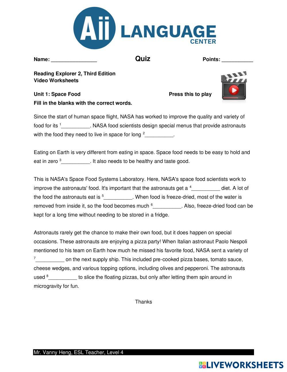 Created byVanny Heng Video Comprehension Video Comprehension Age 10+ level: 4 English Author's Instructions My Google Classroom Courses × 0 classes selected (0 students total) Quick Access Select all classes (0 classes) All Classes Loading courses... Cancel Share Share to selected Course __COURSE_NAME__ __STUDENT_NAME__ (__STUDENT_EMAIL__) REX2 3rd Edition_Unit1_Videoworksheet_Space Food Download Worksheet Validation Check my answers Emails my answers to my teacher Full name Group/level School subject Teacher's email or key code Close Submit Validating worksheet... (12) Your answers have been sent to your teacher. Good luck! OK We encountered an error submitting your answers. Please try again. OK Advertisement | Go Ad Free Created byVanny Heng Video Comprehension Video Comprehension Age 10+ level: 4 English Author's Instructions