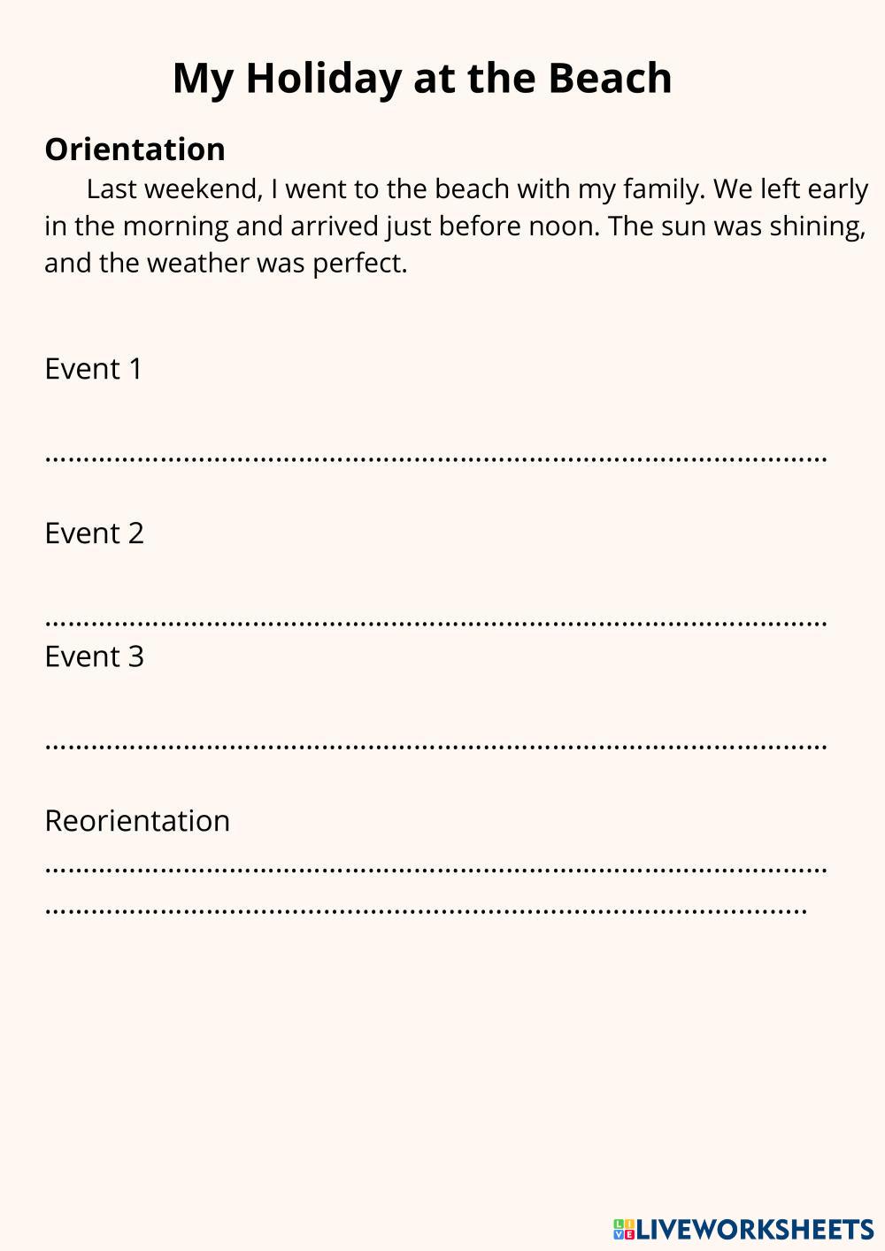 Created byMuslikhah Al Iskhak Writing - presenting Recount text My memorable experience Age 14+ level: 10 English Author's Instructions My Google Classroom Courses × 0 classes selected (0 students total) Quick Access Select all classes (0 classes) All Classes Loading courses... Cancel Share Share to selected Course __COURSE_NAME__ __STUDENT_NAME__ (__STUDENT_EMAIL__) Student's Worksheet Download Worksheet Validation Check my answers Emails my answers to my teacher Full name Group/level School subject Teacher's email or key code Close Submit Validating worksheet... (12) Your answers have been sent to your teacher. Good luck! OK We encountered an error submitting your answers. Please try again. OK Advertisement | Go Ad Free Created byMuslikhah Al Iskhak Writing - presenting Recount text My memorable experience Age 14+ level: 10 English Author's Instructions