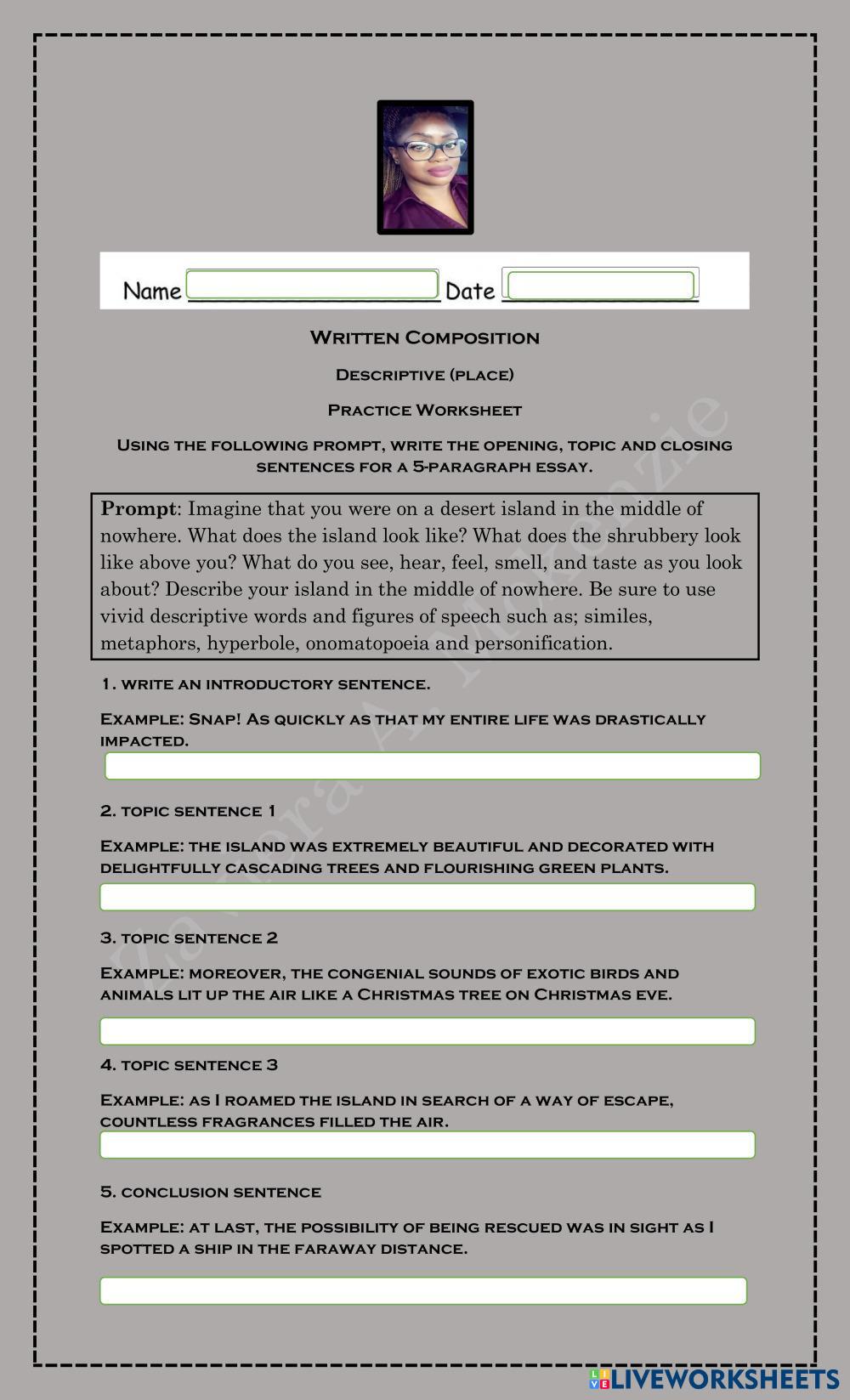 A practice worksheet to assist students with writing introductory and topic sentences for a 5-paragraph essay.