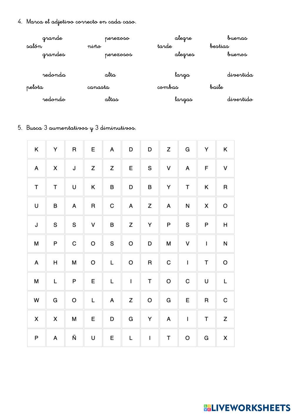 Created byManuel Mariño Carreño Adjetivos aumentativos diminutivos Age 6-11 level: 2º ep Spanish Author's Instructions repaso del tema 4 My Google Classroom Courses × 0 classes selected (0 students total) Quick Access Select all classes (0 classes) All Classes Loading courses... Cancel Share Share to selected Course __COURSE_NAME__ __STUDENT_NAME__ (__STUDENT_EMAIL__) repaso lengua tema 4 23.24 Download Worksheet Validation Check my answers Emails my answers to my teacher Full name Group/level School subject Teacher's email or key code Close Submit Validating worksheet... (12) Your answers have been sent to your teacher. Good luck! OK We encountered an error submitting your answers. Please try again. OK Advertisement | Go Ad Free Created byManuel Mariño Carreño Adjetivos aumentativos diminutivos Age 6-11 level: 2º ep Spanish Author's Instructions repaso del tema 4