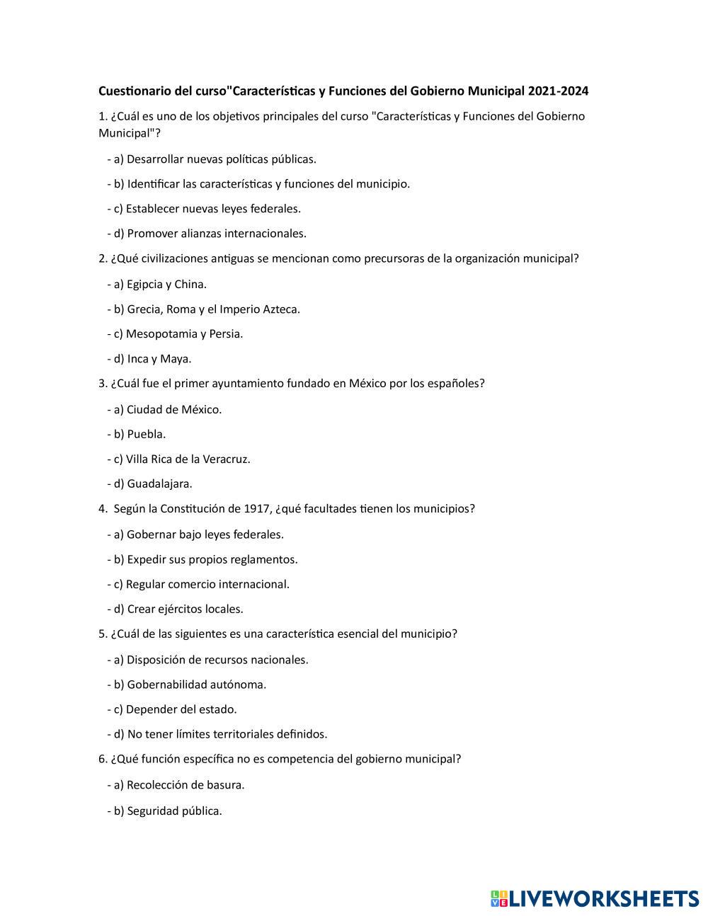 Created by miguel_mota Administración Pública Información sobre el curso Age 18+ level: Principiante Spanish Author's Instructions My Google Classroom Courses × 0 classes selected (0 students total) Quick Access Select all classes (0 classes) All Classes Loading courses... Cancel Share Share to selected Course __COURSE_NAME__ __STUDENT_NAME__ (__STUDENT_EMAIL__) Evaluación del curso Funciones y características del Municipio Download Worksheet Validation Check my answers Emails my answers to my teacher Full name Group/level School subject Teacher's email or key code Close Submit Validating worksheet... (12) Your answers have been sent to your teacher. Good luck! OK We encountered an error submitting your answers. Please try again. OK Advertisement | Go Ad Free Created by miguel_mota Administración Pública Información sobre el curso Age 18+ level: Principiante Spanish Author's Instructions