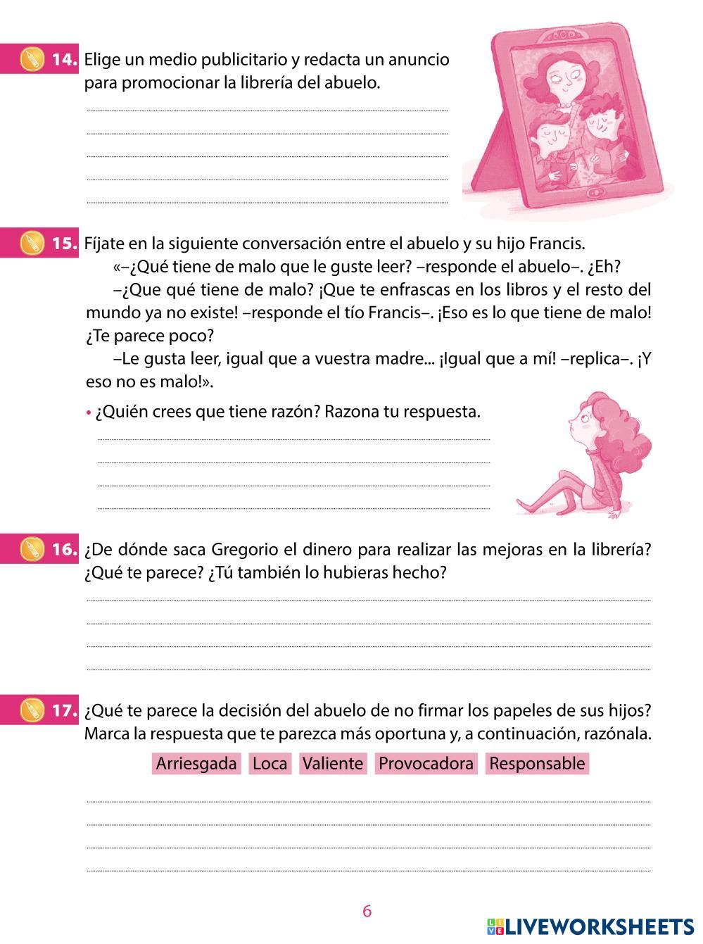 Created by Marcoscazorlaperez alumnos libro de lectura Age 8-13 level: 5º Spanish Author's Instructions My Google Classroom Courses × 0 classes selected (0 students total) Quick Access Select all classes (0 classes) All Classes Loading courses... Cancel Share Share to selected Course __COURSE_NAME__ __STUDENT_NAME__ (__STUDENT_EMAIL__) Castigado sin leer Download Worksheet Validation Check my answers Emails my answers to my teacher Full name Group/level School subject Teacher's email or key code Close Submit Validating worksheet... (12) Your answers have been sent to your teacher. Good luck! OK We encountered an error submitting your answers. Please try again. OK Advertisement | Go Ad Free Created by Marcoscazorlaperez alumnos libro de lectura Age 8-13 level: 5º Spanish Author's Instructions