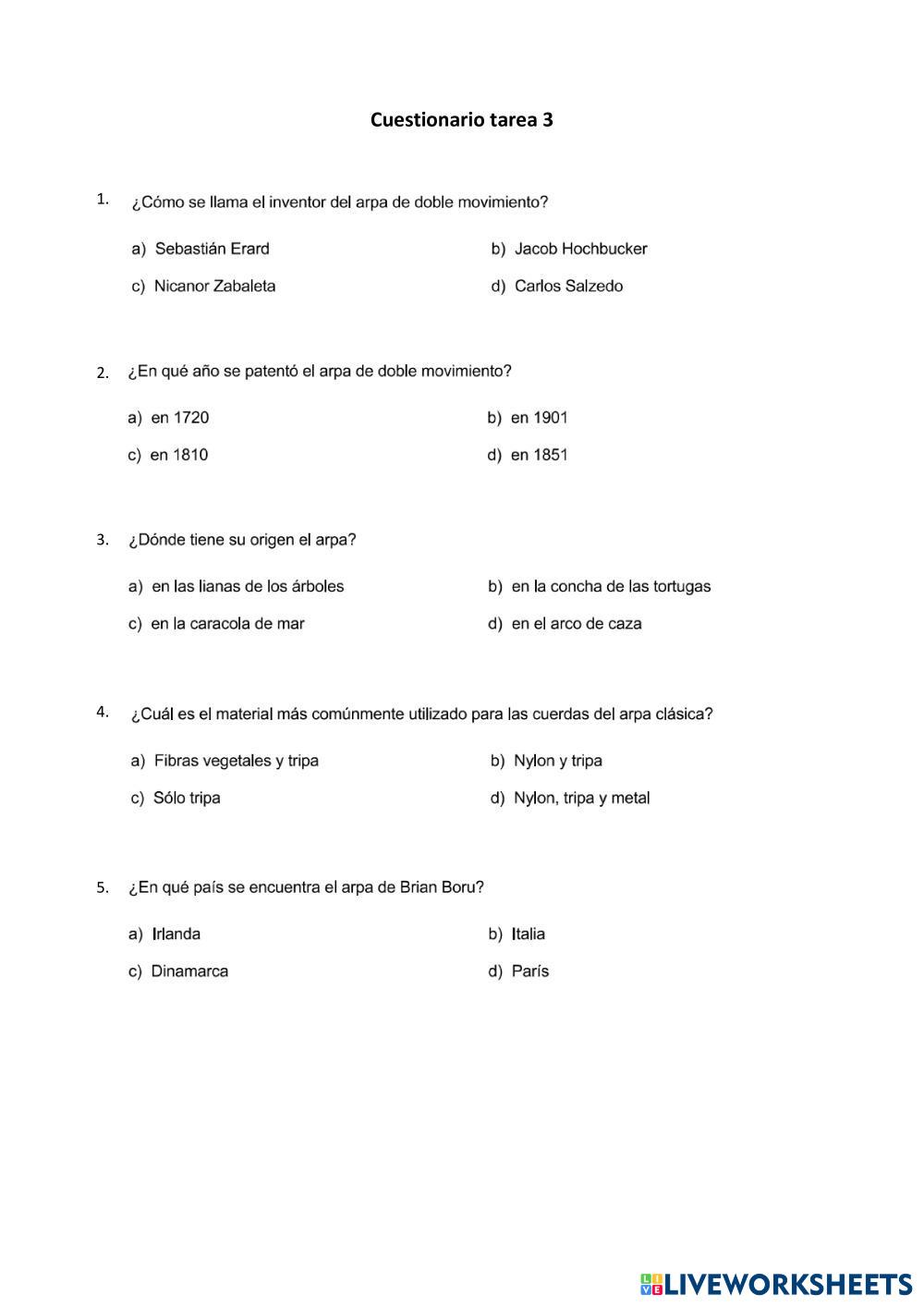 Created bynoemi martinez Arpa Historia del Arpa Age 9-15 level: 4º E.E. Spanish Author's Instructions My Google Classroom Courses × 0 classes selected (0 students total) Quick Access Select all classes (0 classes) All Classes Loading courses... Cancel Share Share to selected Course __COURSE_NAME__ __STUDENT_NAME__ (__STUDENT_EMAIL__) Cuestionario Paso 3 Download Worksheet Validation Check my answers Emails my answers to my teacher Full name Group/level School subject Teacher's email or key code Close Submit Validating worksheet... (12) Your answers have been sent to your teacher. Good luck! OK We encountered an error submitting your answers. Please try again. OK Advertisement | Go Ad Free Created bynoemi martinez Arpa Historia del Arpa Age 9-15 level: 4º E.E. Spanish Author's Instructions