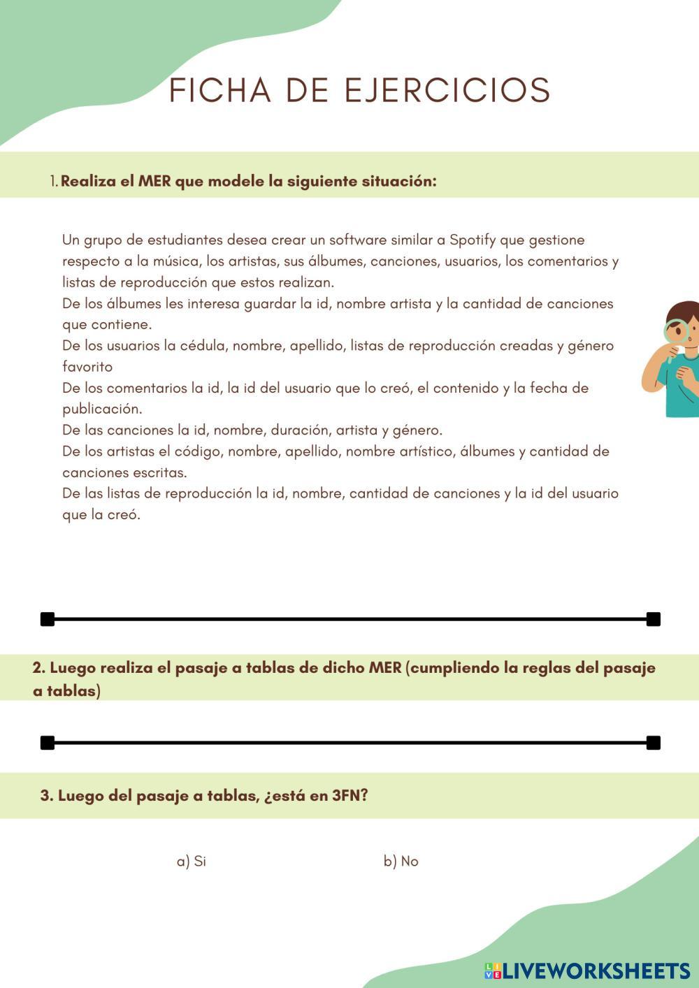 Created by MicaAispuroprofe Base de datos 3FN Age 16-15 level: Secundary Spanish Author's Instructions My Google Classroom Courses × 0 classes selected (0 students total) Quick Access Select all classes (0 classes) All Classes Loading courses... Cancel Share Share to selected Course __COURSE_NAME__ __STUDENT_NAME__ (__STUDENT_EMAIL__) Ficha de ejercicios Download Worksheet Validation Check my answers Emails my answers to my teacher Full name Group/level School subject Teacher's email or key code Close Submit Validating worksheet... (12) Your answers have been sent to your teacher. Good luck! OK We encountered an error submitting your answers. Please try again. OK Advertisement | Go Ad Free Created by MicaAispuroprofe Base de datos 3FN Age 16-15 level: Secundary Spanish Author's Instructions