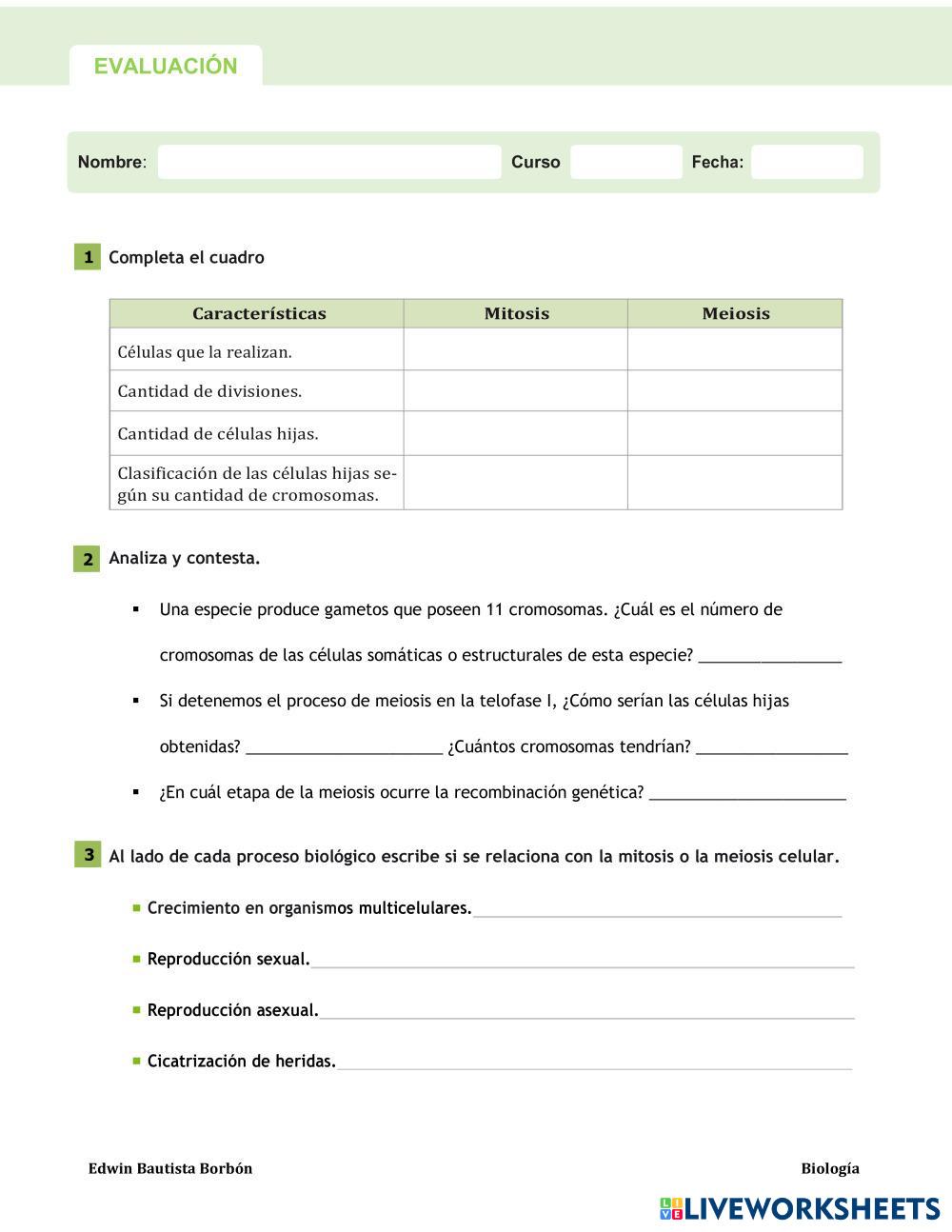 Created byEdwin Bautista Borbón Biología Naturales Age 15+ level: 1 Spanish Author's Instructions My Google Classroom Courses × 0 classes selected (0 students total) Quick Access Select all classes (0 classes) All Classes Loading courses... Cancel Share Share to selected Course __COURSE_NAME__ __STUDENT_NAME__ (__STUDENT_EMAIL__) Reproducción: Mitosis y meiosis Download Worksheet Validation Check my answers Emails my answers to my teacher Full name Group/level School subject Teacher's email or key code Close Submit Validating worksheet... (12) Your answers have been sent to your teacher. Good luck! OK We encountered an error submitting your answers. Please try again. OK Advertisement | Go Ad Free Created byEdwin Bautista Borbón Biología Naturales Age 15+ level: 1 Spanish Author's Instructions