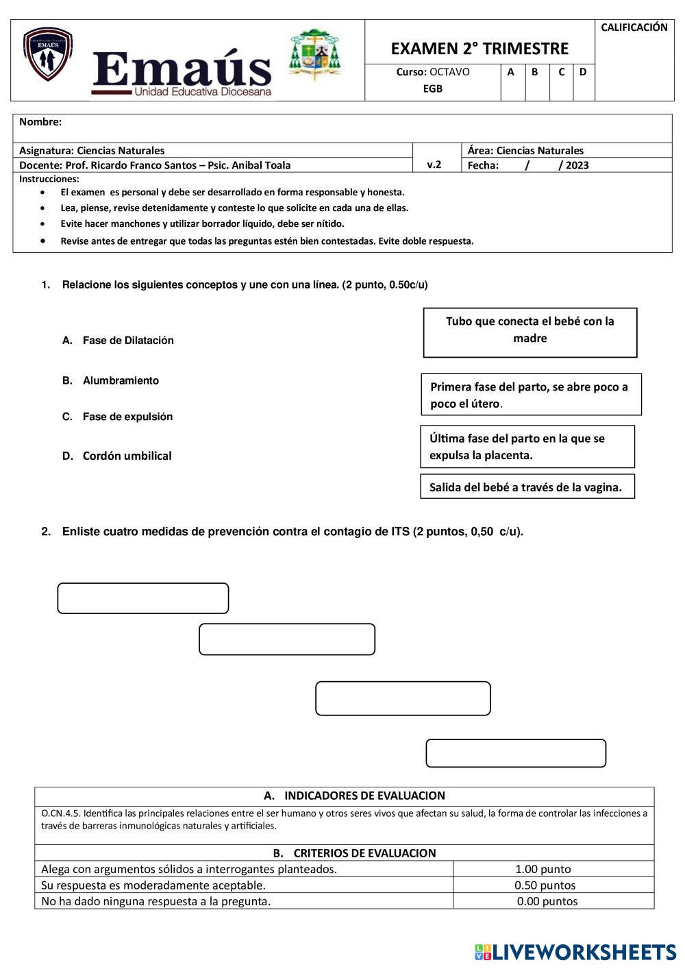 Created by 0953935566 Ciencias de la Naturaleza Fecundación Age 12-15 level: 12 Spanish Author's Instructions My Google Classroom Courses × 0 classes selected (0 students total) Quick Access Select all classes (0 classes) All Classes Loading courses... Cancel Share Share to selected Course __COURSE_NAME__ __STUDENT_NAME__ (__STUDENT_EMAIL__) EXAMEN 2DO TRIMESTRE Download Worksheet Validation Check my answers Emails my answers to my teacher Full name Group/level School subject Teacher's email or key code Close Submit Validating worksheet... (12) Your answers have been sent to your teacher. Good luck! OK We encountered an error submitting your answers. Please try again. OK Advertisement | Go Ad Free Created by 0953935566 Ciencias de la Naturaleza Fecundación Age 12-15 level: 12 Spanish Author's Instructions