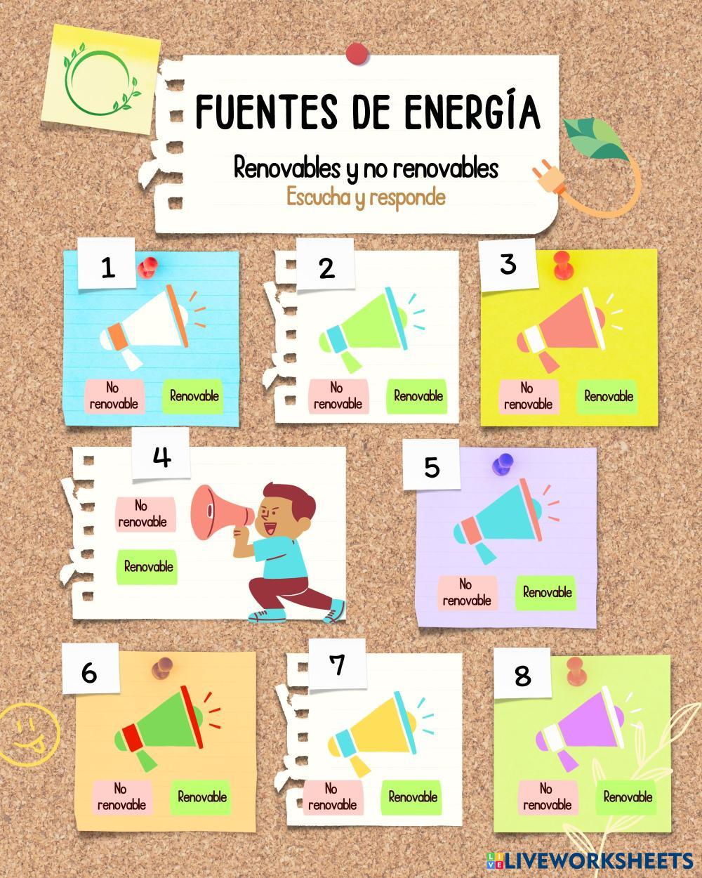 Al pulsar cada megáfono sonará el nombre de una fuente de energía, el alumno debe seleccionar en cada una si es renovable o no.