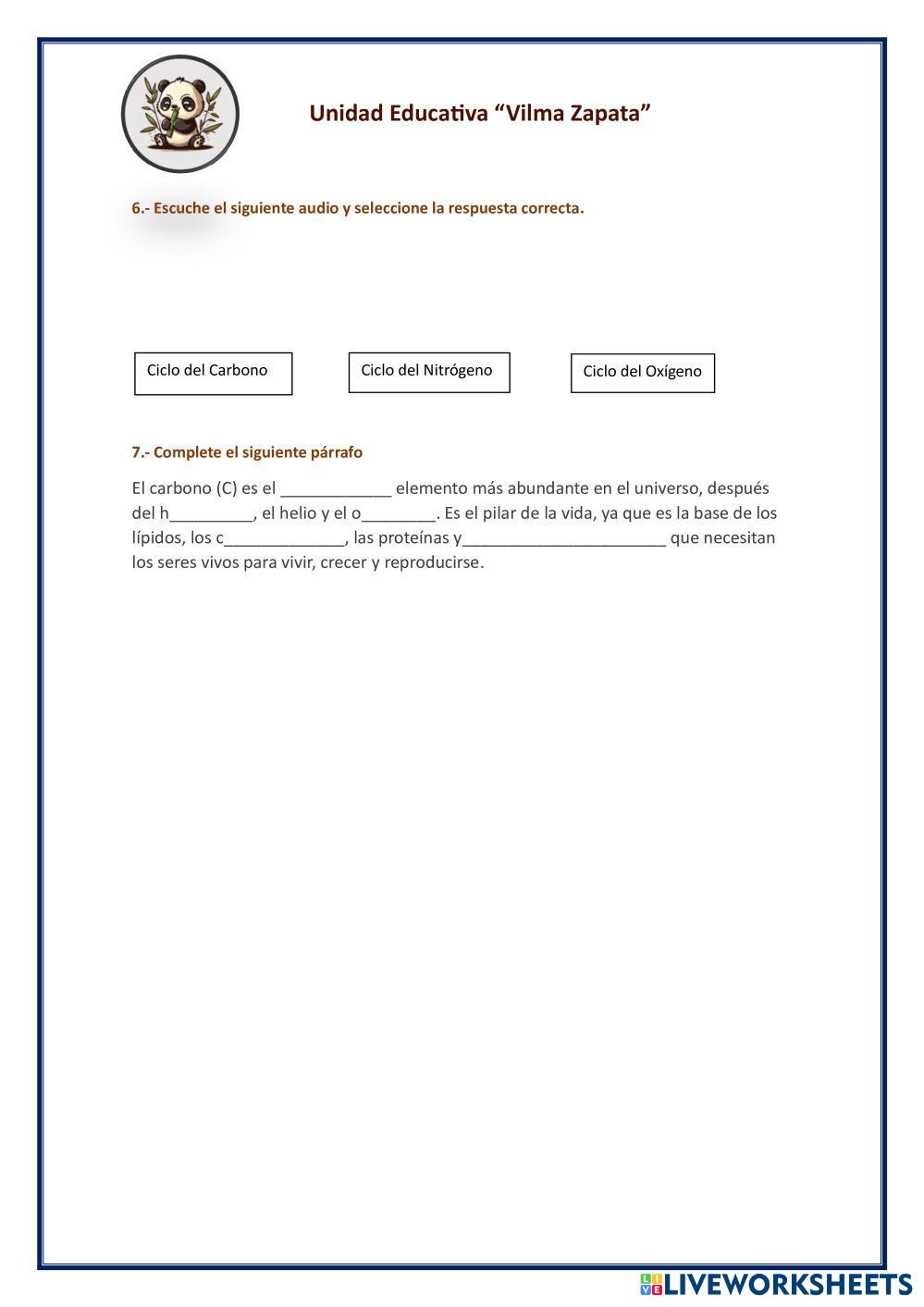 Created byVilma Zapata CIENCIAS NATURALES Ciclos biogeoquímicos Age 12+ level: 10MO de Básica Spanish Author's Instructions My Google Classroom Courses × 0 classes selected (0 students total) Quick Access Select all classes (0 classes) All Classes Loading courses... Cancel Share Share to selected Course __COURSE_NAME__ __STUDENT_NAME__ (__STUDENT_EMAIL__) Actividad Naturales. Download Worksheet Validation Check my answers Emails my answers to my teacher Full name Group/level School subject Teacher's email or key code Close Submit Validating worksheet... (12) Your answers have been sent to your teacher. Good luck! OK We encountered an error submitting your answers. Please try again. OK Advertisement | Go Ad Free Created byVilma Zapata CIENCIAS NATURALES Ciclos biogeoquímicos Age 12+ level: 10MO de Básica Spanish Author's Instructions