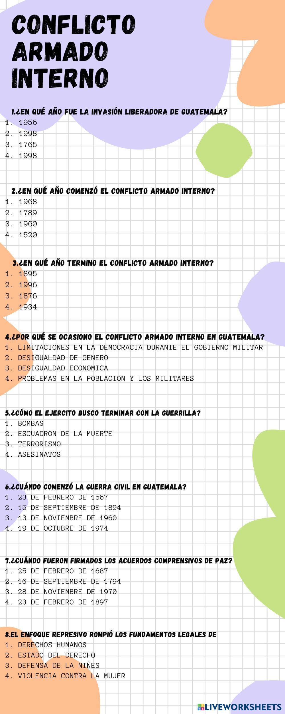 Created byCarlos Robles Ciencias Sociales Conflicto armado interno Age 15+ level: 9 Spanish Author's Instructions My Google Classroom Courses × 0 classes selected (0 students total) Quick Access Select all classes (0 classes) All Classes Loading courses... Cancel Share Share to selected Course __COURSE_NAME__ __STUDENT_NAME__ (__STUDENT_EMAIL__) Conflicto armado interno Download Worksheet Validation Check my answers Emails my answers to my teacher Full name Group/level School subject Teacher's email or key code Close Submit Validating worksheet... (12) Your answers have been sent to your teacher. Good luck! OK We encountered an error submitting your answers. Please try again. OK Advertisement | Go Ad Free Created byCarlos Robles Ciencias Sociales Conflicto armado interno Age 15+ level: 9 Spanish Author's Instructions
