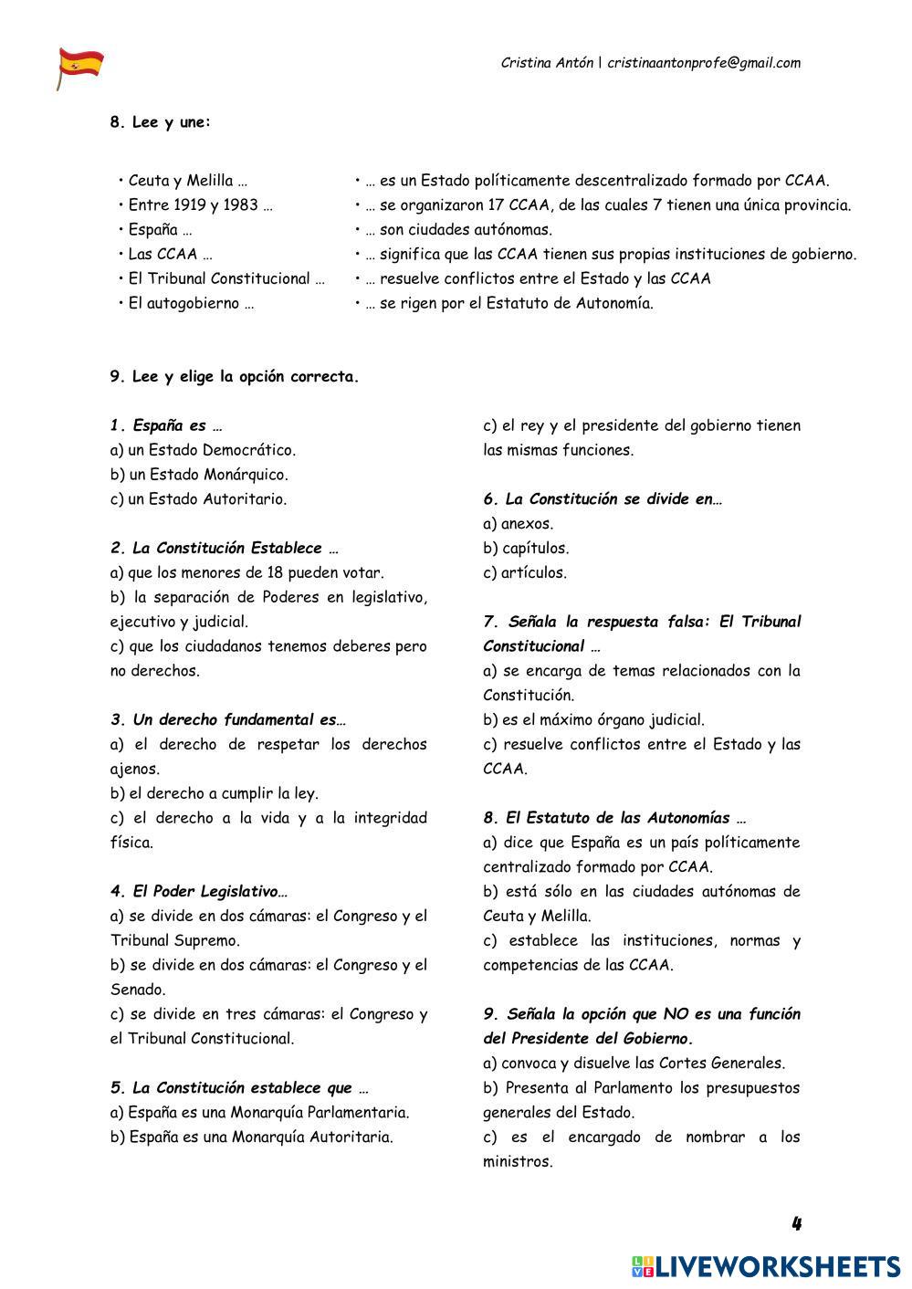 Created by cristinaantonprofe Ciencias Sociales La Constitución Age 8-15 level: 5º de primaria Spanish Author's Instructions My Google Classroom Courses × 0 classes selected (0 students total) Quick Access Select all classes (0 classes) All Classes Loading courses... Cancel Share Share to selected Course __COURSE_NAME__ __STUDENT_NAME__ (__STUDENT_EMAIL__) La organización política y territorial de España Download Worksheet Validation Check my answers Emails my answers to my teacher Full name Group/level School subject Teacher's email or key code Close Submit Validating worksheet... (12) Your answers have been sent to your teacher. Good luck! OK We encountered an error submitting your answers. Please try again. OK Advertisement | Go Ad Free Created by cristinaantonprofe Ciencias Sociales La Constitución Age 8-15 level: 5º de primaria Spanish Author's Instructions