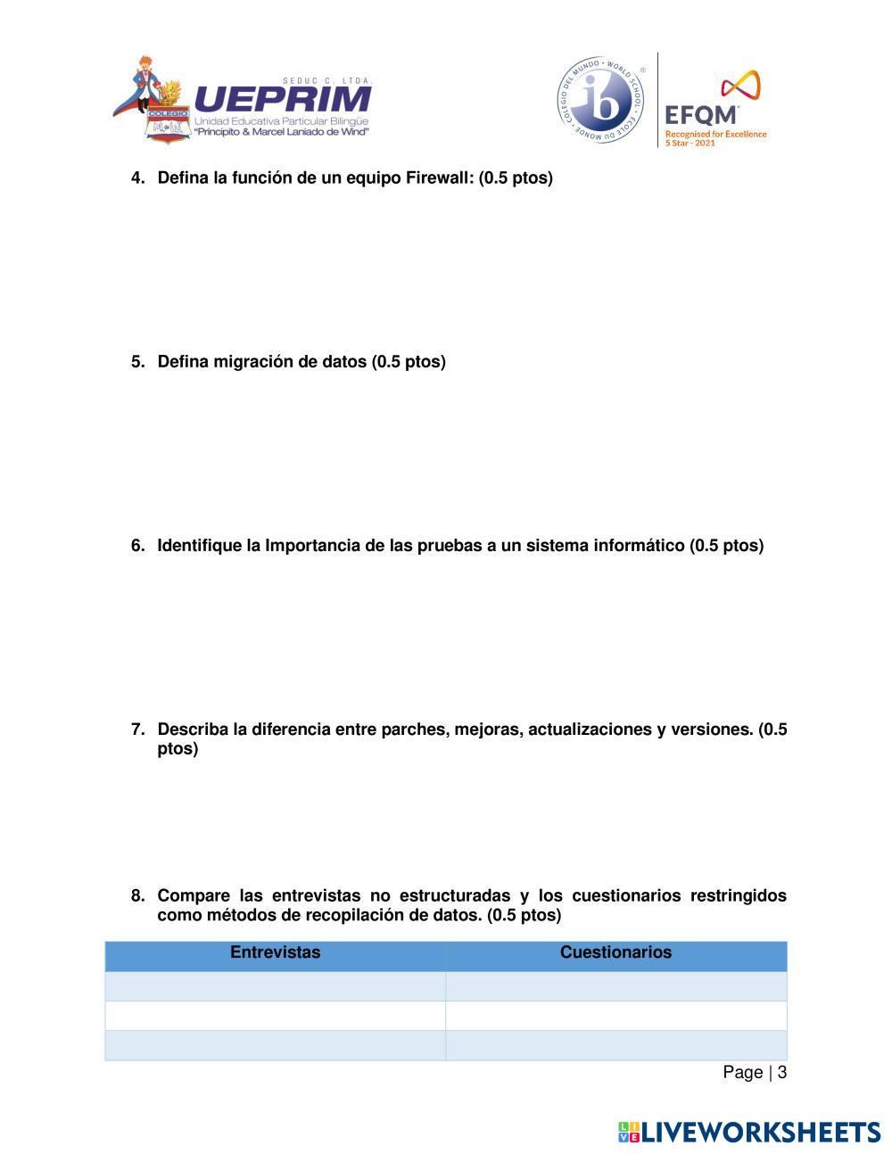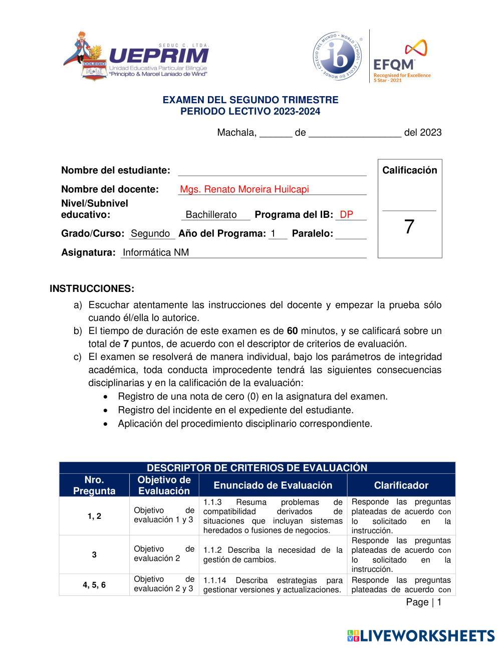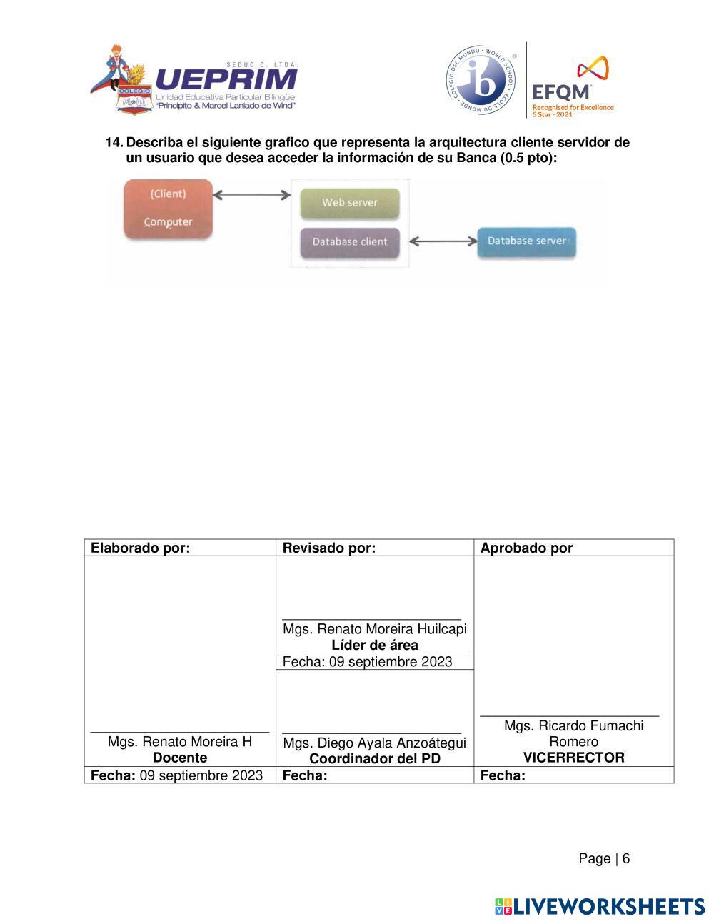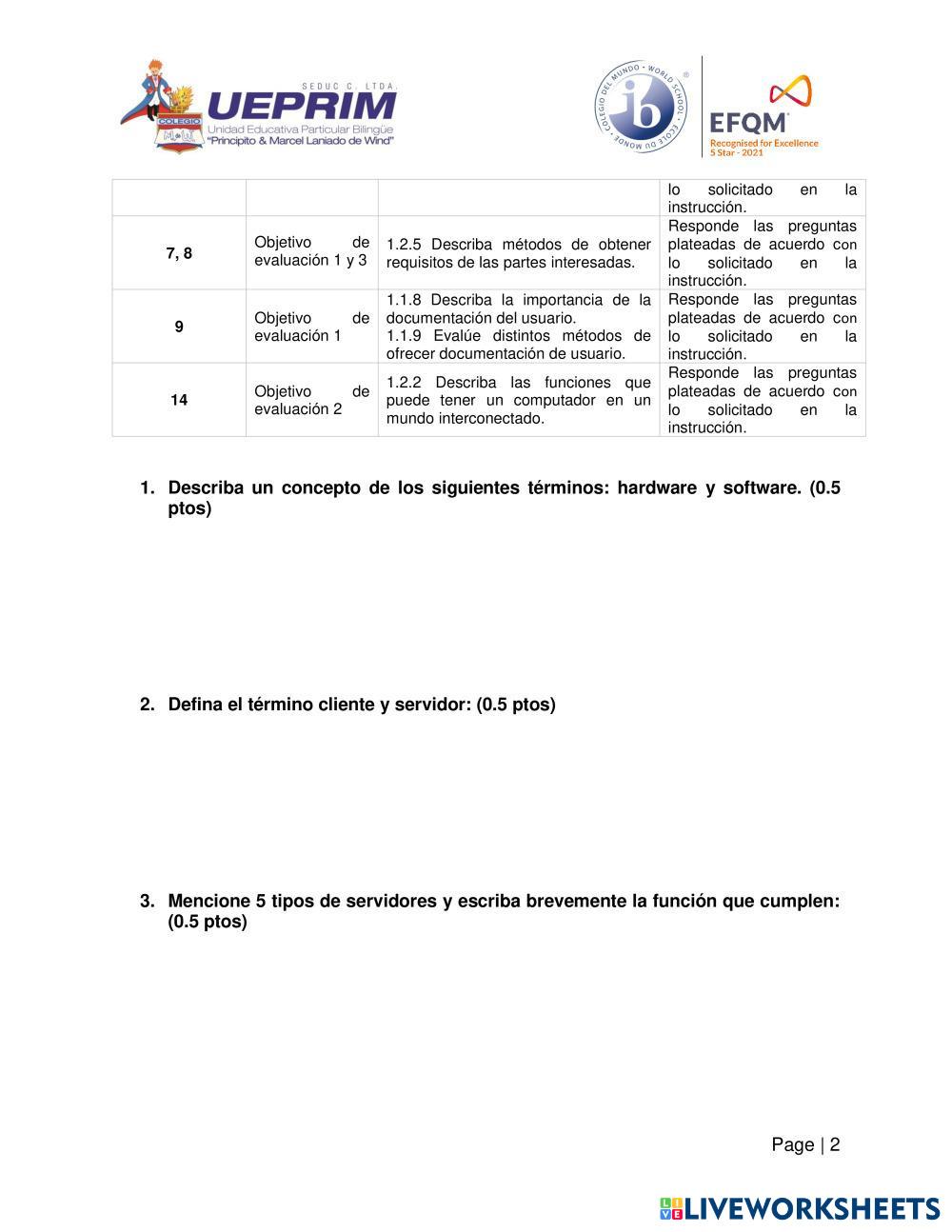 Created byRenato Moreira Computer science Topic 1.2 Age 15-13 level: SL Spanish Author's Instructions My Google Classroom Courses × 0 classes selected (0 students total) Quick Access Select all classes (0 classes) All Classes Loading courses... Cancel Share Share to selected Course __COURSE_NAME__ __STUDENT_NAME__ (__STUDENT_EMAIL__) Computer Science Exam Download Worksheet Validation Check my answers Emails my answers to my teacher Full name Group/level School subject Teacher's email or key code Close Submit Validating worksheet... (12) Your answers have been sent to your teacher. Good luck! OK We encountered an error submitting your answers. Please try again. OK Advertisement | Go Ad Free Created byRenato Moreira Computer science Topic 1.2 Age 15-13 level: SL Spanish Author's Instructions