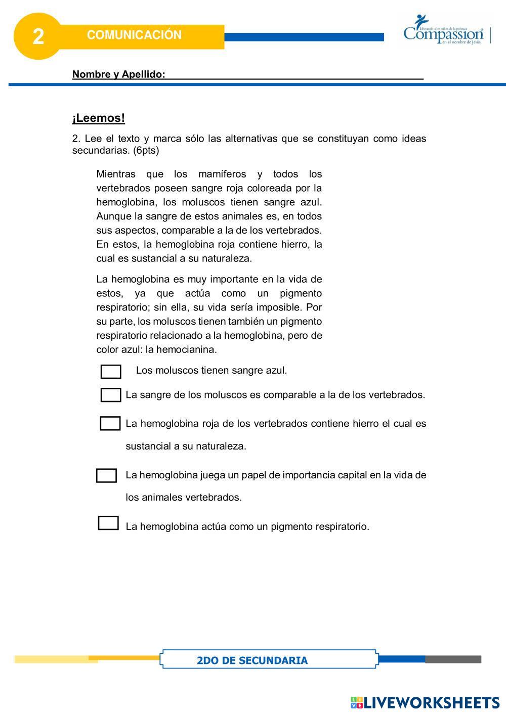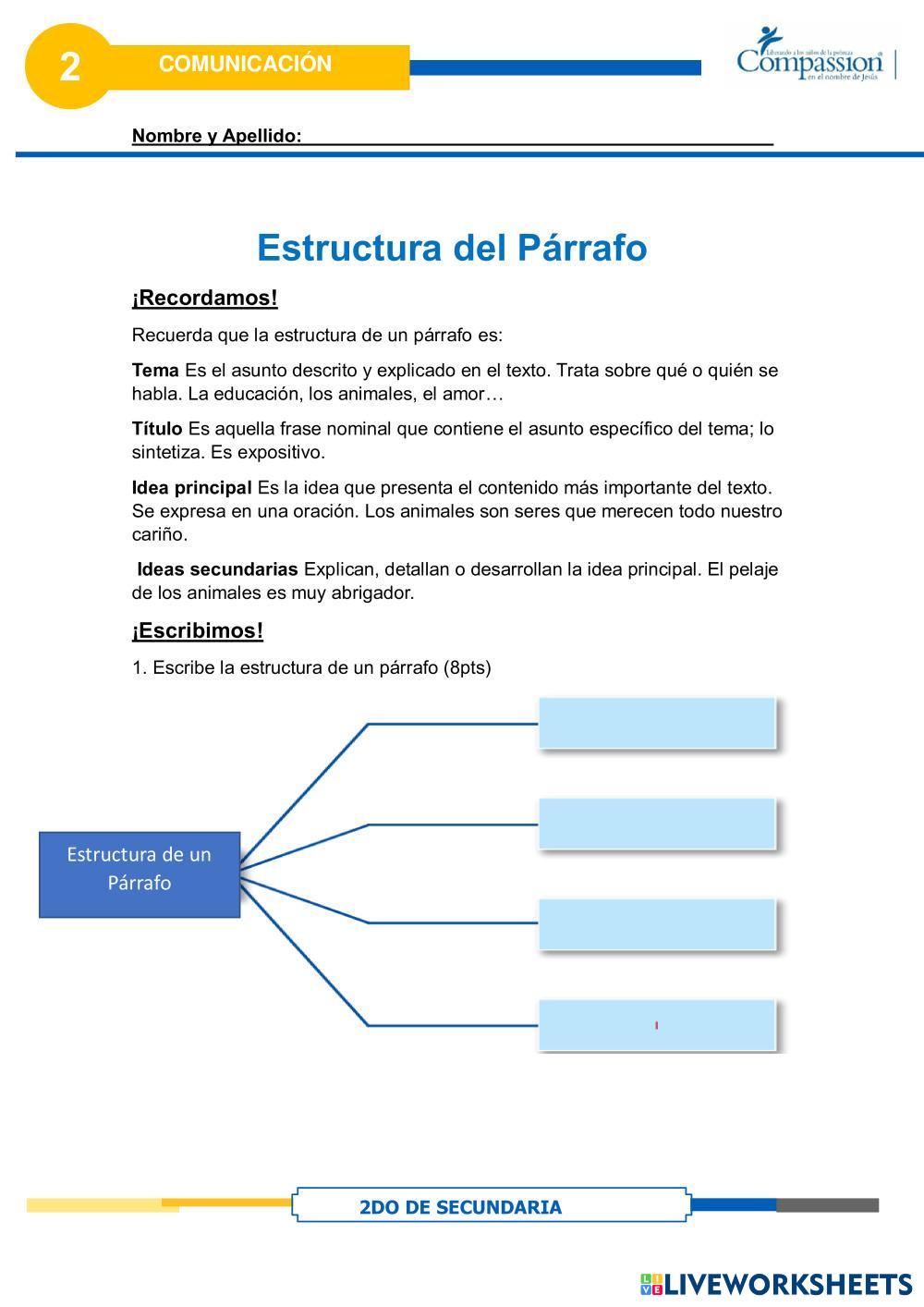 Created byCompassion international del Perú Comunicación Estructura del Párrafo Age 12-17 level: 2do Secundaria Spanish Author's Instructions My Google Classroom Courses × 0 classes selected (0 students total) Quick Access Select all classes (0 classes) All Classes Loading courses... Cancel Share Share to selected Course __COURSE_NAME__ __STUDENT_NAME__ (__STUDENT_EMAIL__) Estructura del Párrafo Download Worksheet Validation Check my answers Emails my answers to my teacher Full name Group/level School subject Teacher's email or key code Close Submit Validating worksheet... (12) Your answers have been sent to your teacher. Good luck! OK We encountered an error submitting your answers. Please try again. OK Advertisement | Go Ad Free Created byCompassion international del Perú Comunicación Estructura del Párrafo Age 12-17 level: 2do Secundaria Spanish Author's Instructions