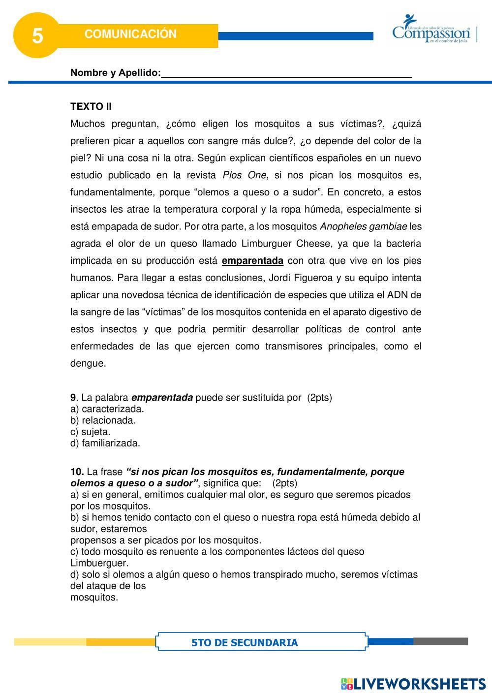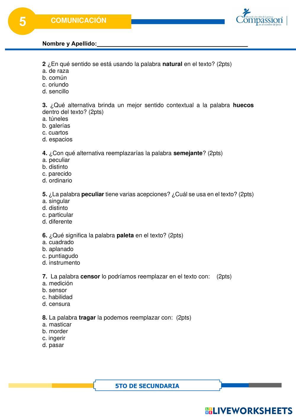 Created byCompassion international del Perú Comunicación Palabras en contexto Age 16+ level: 5to Secundaria Spanish Author's Instructions My Google Classroom Courses × 0 classes selected (0 students total) Quick Access Select all classes (0 classes) All Classes Loading courses... Cancel Share Share to selected Course __COURSE_NAME__ __STUDENT_NAME__ (__STUDENT_EMAIL__) Palabras en contexto Download Worksheet Validation Check my answers Emails my answers to my teacher Full name Group/level School subject Teacher's email or key code Close Submit Validating worksheet... (12) Your answers have been sent to your teacher. Good luck! OK We encountered an error submitting your answers. Please try again. OK Advertisement | Go Ad Free Created byCompassion international del Perú Comunicación Palabras en contexto Age 16+ level: 5to Secundaria Spanish Author's Instructions
