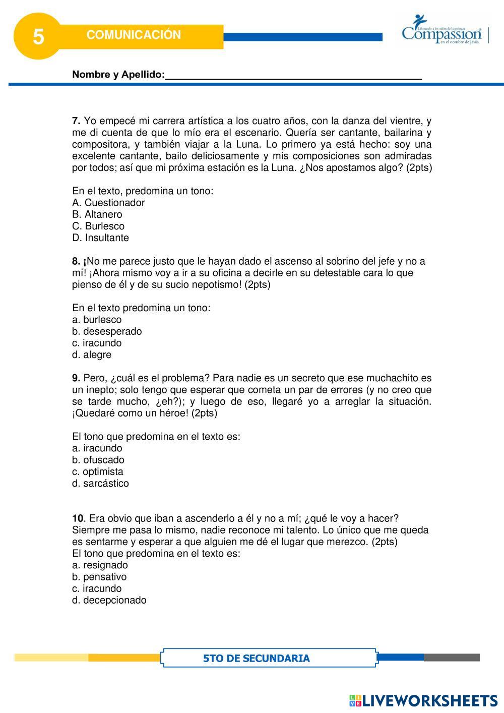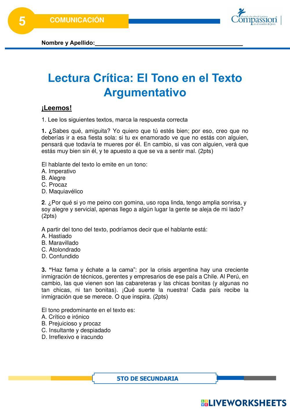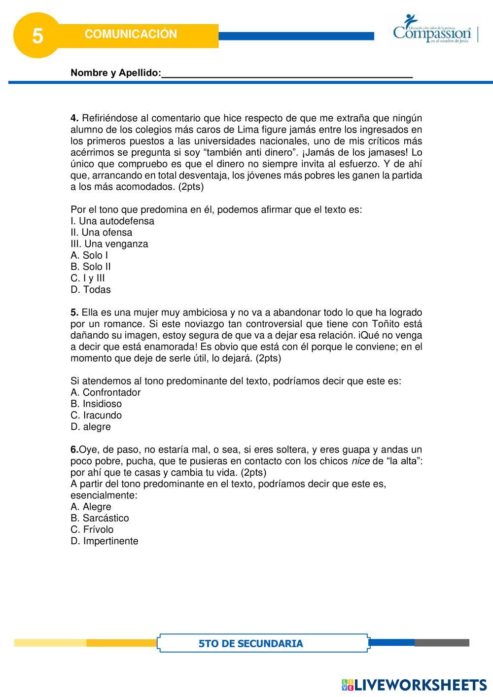 Created byCompassion international del Perú Comunicación Lectura Crítica El tono en el Texto Age 16+ level: 5to Secundaria Spanish Author's Instructions My Google Classroom Courses × 0 classes selected (0 students total) Quick Access Select all classes (0 classes) All Classes Loading courses... Cancel Share Share to selected Course __COURSE_NAME__ __STUDENT_NAME__ (__STUDENT_EMAIL__) Lectura Crítica El tono en el Texto Download Worksheet Validation Check my answers Emails my answers to my teacher Full name Group/level School subject Teacher's email or key code Close Submit Validating worksheet... (12) Your answers have been sent to your teacher. Good luck! OK We encountered an error submitting your answers. Please try again. OK Advertisement | Go Ad Free Created byCompassion international del Perú Comunicación Lectura Crítica El tono en el Texto Age 16+ level: 5to Secundaria Spanish Author's Instructions