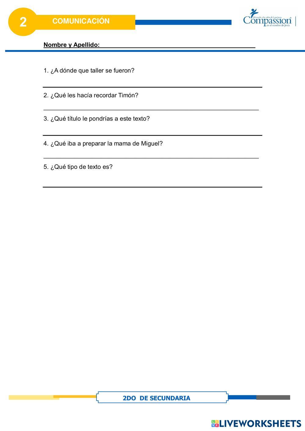 Created byCompassion international del Perú Comunicación Habilidad Lectora Age 12-17 level: 2do Secundaria Spanish Author's Instructions My Google Classroom Courses × 0 classes selected (0 students total) Quick Access Select all classes (0 classes) All Classes Loading courses... Cancel Share Share to selected Course __COURSE_NAME__ __STUDENT_NAME__ (__STUDENT_EMAIL__) Habilidad Lectora Download Worksheet Validation Check my answers Emails my answers to my teacher Full name Group/level School subject Teacher's email or key code Close Submit Validating worksheet... (12) Your answers have been sent to your teacher. Good luck! OK We encountered an error submitting your answers. Please try again. OK Advertisement | Go Ad Free Created byCompassion international del Perú Comunicación Habilidad Lectora Age 12-17 level: 2do Secundaria Spanish Author's Instructions