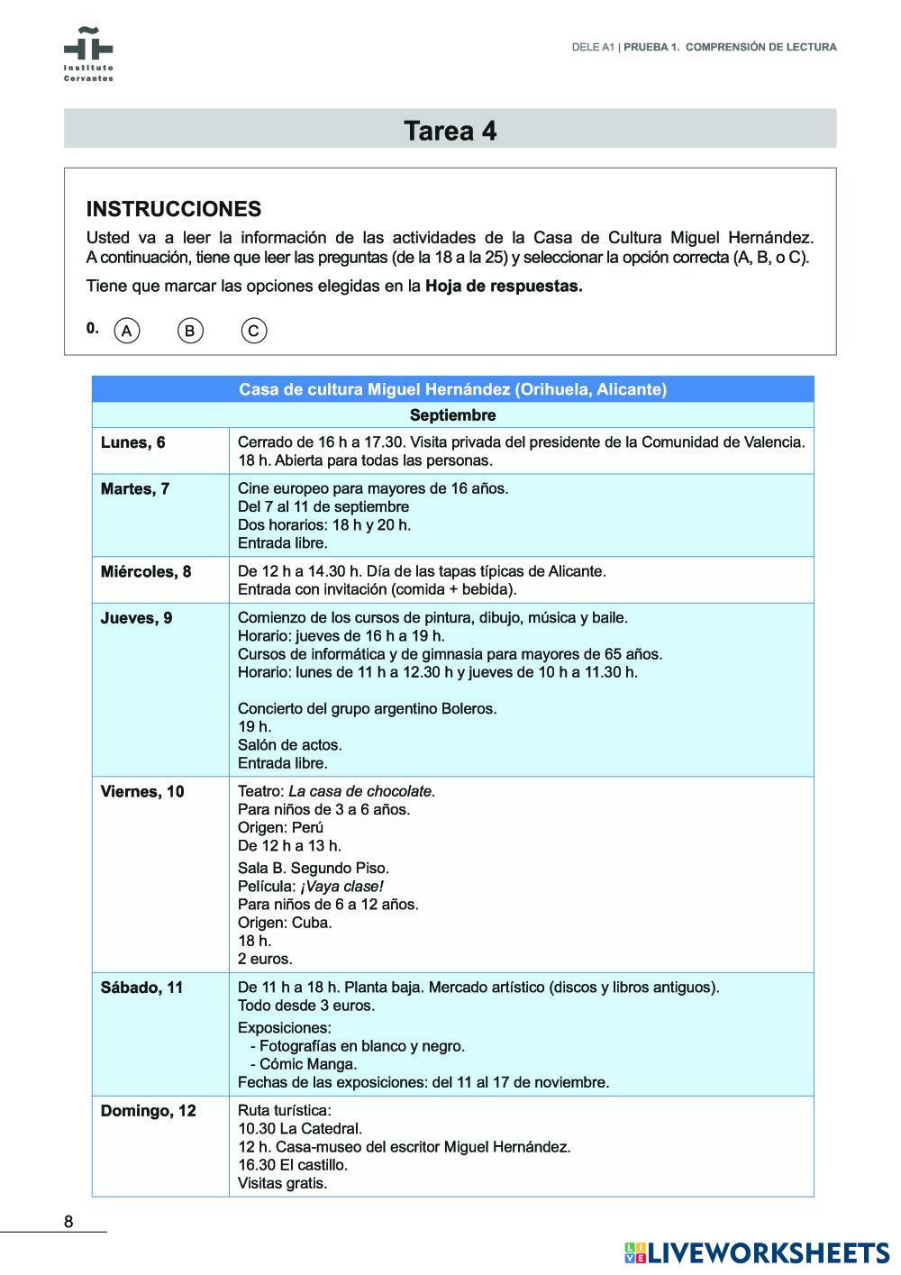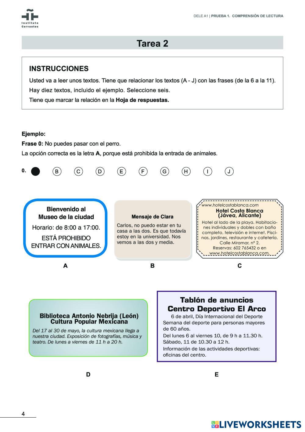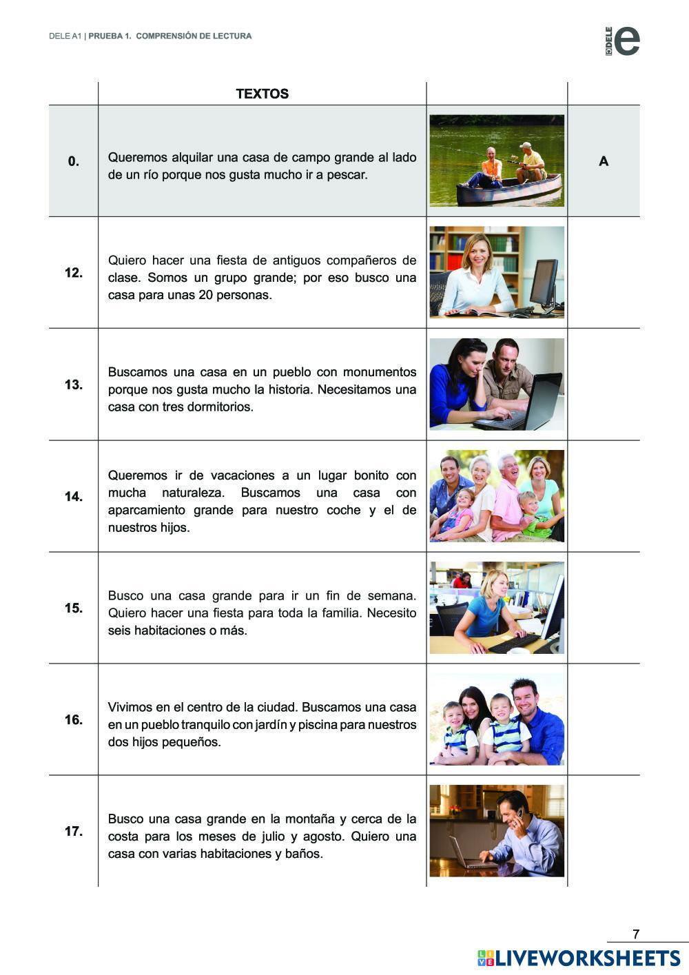 Created by Francisnaide79 DELE A1- Comprensión Lectora DELE A1- Comprensión Lectora Age 18+ level: A1 Spanish Author's Instructions My Google Classroom Courses × 0 classes selected (0 students total) Quick Access Select all classes (0 classes) All Classes Loading courses... Cancel Share Share to selected Course __COURSE_NAME__ __STUDENT_NAME__ (__STUDENT_EMAIL__) Comprensión Lectora- Tareas Download Worksheet Validation Check my answers Emails my answers to my teacher Full name Group/level School subject Teacher's email or key code Close Submit Validating worksheet... (12) Your answers have been sent to your teacher. Good luck! OK We encountered an error submitting your answers. Please try again. OK Advertisement | Go Ad Free Created by Francisnaide79 DELE A1- Comprensión Lectora DELE A1- Comprensión Lectora Age 18+ level: A1 Spanish Author's Instructions