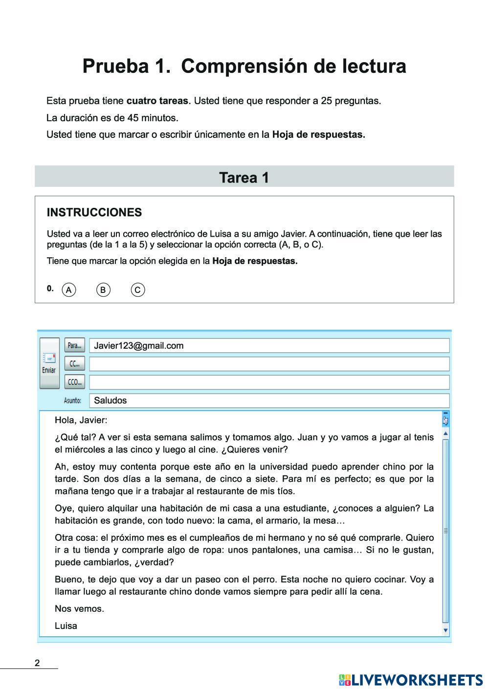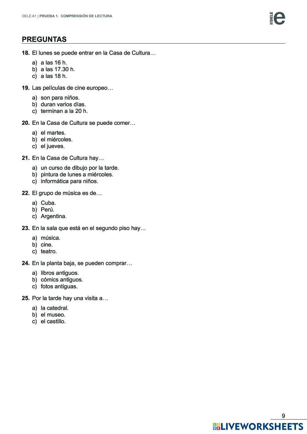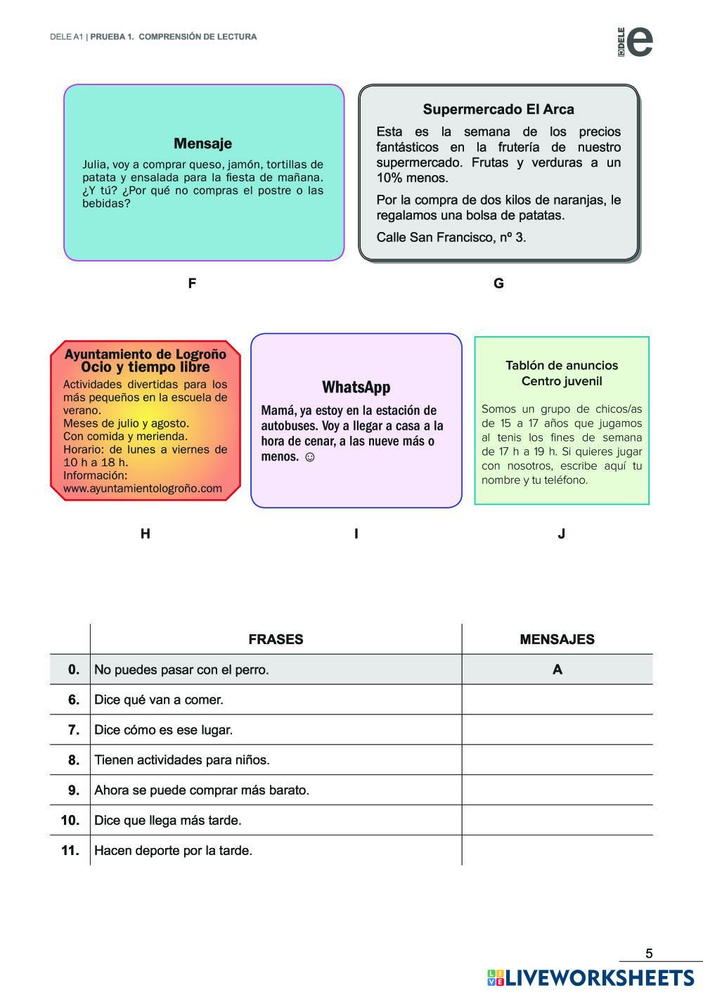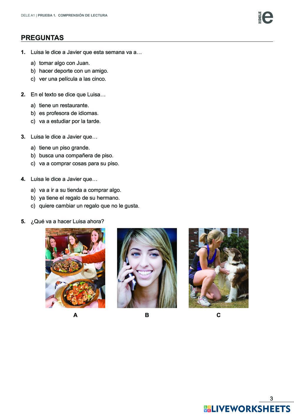 Created by Francisnaide79 DELE A1- Comprensión Lectora DELE A1- Comprensión Lectora Age 18+ level: A1 Spanish Author's Instructions My Google Classroom Courses × 0 classes selected (0 students total) Quick Access Select all classes (0 classes) All Classes Loading courses... Cancel Share Share to selected Course __COURSE_NAME__ __STUDENT_NAME__ (__STUDENT_EMAIL__) Comprensión Lectora- Tareas Download Worksheet Validation Check my answers Emails my answers to my teacher Full name Group/level School subject Teacher's email or key code Close Submit Validating worksheet... (12) Your answers have been sent to your teacher. Good luck! OK We encountered an error submitting your answers. Please try again. OK Advertisement | Go Ad Free Created by Francisnaide79 DELE A1- Comprensión Lectora DELE A1- Comprensión Lectora Age 18+ level: A1 Spanish Author's Instructions