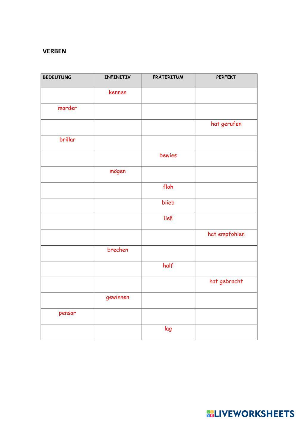 Created byMyriam P. de la Vega Torralba Deutsch als Fremdsprache (DaF) Verben Age 14+ level: B1 Spanish Author's Instructions My Google Classroom Courses × 0 classes selected (0 students total) Quick Access Select all classes (0 classes) All Classes Loading courses... Cancel Share Share to selected Course __COURSE_NAME__ __STUDENT_NAME__ (__STUDENT_EMAIL__) Verben 4ºESO_2ª EVA Download Worksheet Validation Check my answers Emails my answers to my teacher Full name Group/level School subject Teacher's email or key code Close Submit Validating worksheet... (12) Your answers have been sent to your teacher. Good luck! OK We encountered an error submitting your answers. Please try again. OK Advertisement | Go Ad Free Created byMyriam P. de la Vega Torralba Deutsch als Fremdsprache (DaF) Verben Age 14+ level: B1 Spanish Author's Instructions