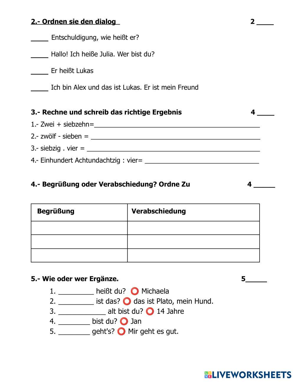 Created byGuadalupe Garcia Deutsch Deutsch Age 10-17 level: A1.1 Spanish Author's Instructions My Google Classroom Courses × 0 classes selected (0 students total) Quick Access Select all classes (0 classes) All Classes Loading courses... Cancel Share Share to selected Course __COURSE_NAME__ __STUDENT_NAME__ (__STUDENT_EMAIL__) Frau Garcia Download Worksheet Validation Check my answers Emails my answers to my teacher Full name Group/level School subject Teacher's email or key code Close Submit Validating worksheet... (12) Your answers have been sent to your teacher. Good luck! OK We encountered an error submitting your answers. Please try again. OK Advertisement | Go Ad Free Created byGuadalupe Garcia Deutsch Deutsch Age 10-17 level: A1.1 Spanish Author's Instructions