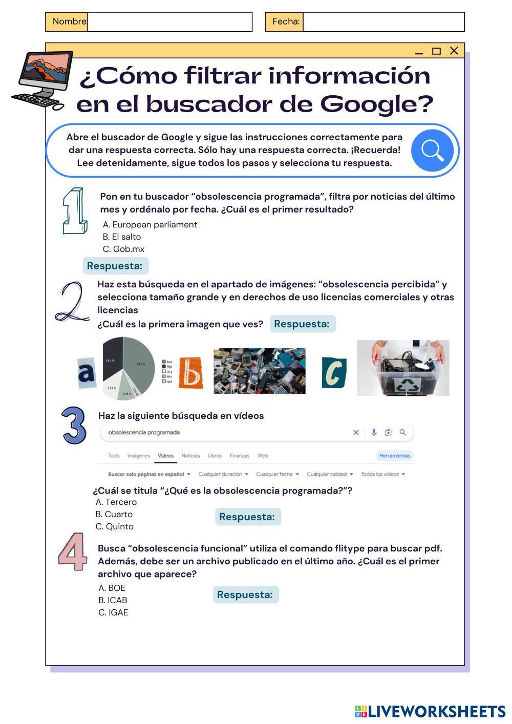 Created byCarmen González Rodríguez Digitalización Aplicada Motores de búsqueda Age 12-17 level: 1º ESO Spanish Author's Instructions My Google Classroom Courses × 0 classes selected (0 students total) Quick Access Select all classes (0 classes) All Classes Loading courses... Cancel Share Share to selected Course __COURSE_NAME__ __STUDENT_NAME__ (__STUDENT_EMAIL__) CONFIGURACIÓN DE BÚSQUEDA Download Worksheet Validation Check my answers Emails my answers to my teacher Full name Group/level School subject Teacher's email or key code Close Submit Validating worksheet... (12) Your answers have been sent to your teacher. Good luck! OK We encountered an error submitting your answers. Please try again. OK Advertisement | Go Ad Free Created byCarmen González Rodríguez Digitalización Aplicada Motores de búsqueda Age 12-17 level: 1º ESO Spanish Author's Instructions