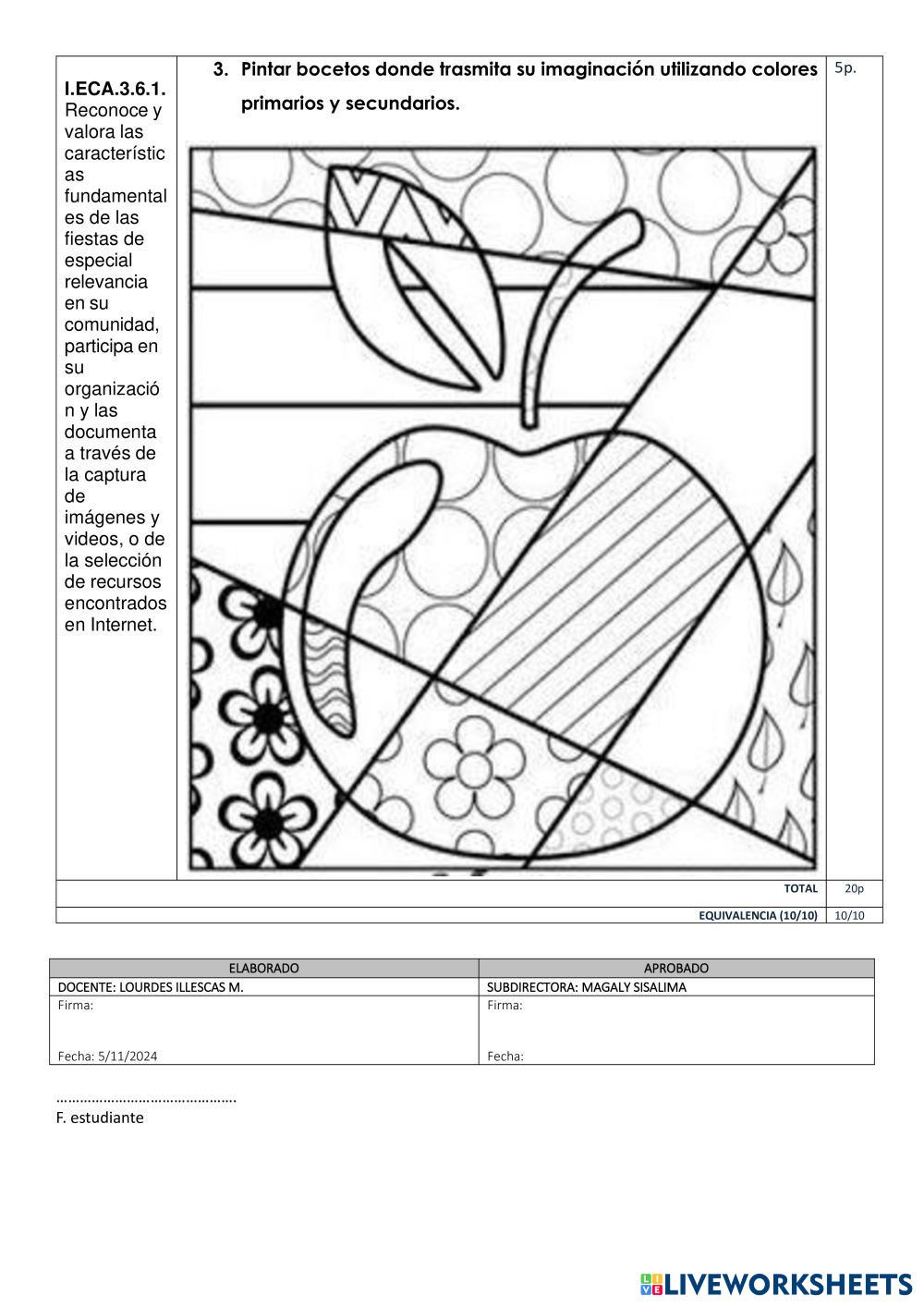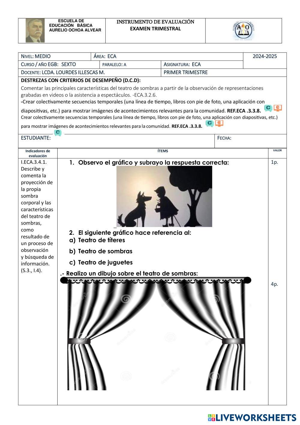 Created byLurdes Mirella Illescas Mogrovejo Educación Artística Evaluación Quimestral ECA Age 8-14 level: Sexto Spanish Author's Instructions My Google Classroom Courses × 0 classes selected (0 students total) Quick Access Select all classes (0 classes) All Classes Loading courses... Cancel Share Share to selected Course __COURSE_NAME__ __STUDENT_NAME__ (__STUDENT_EMAIL__) Evaluación Download Worksheet Validation Check my answers Emails my answers to my teacher Full name Group/level School subject Teacher's email or key code Close Submit Validating worksheet... (12) Your answers have been sent to your teacher. Good luck! OK We encountered an error submitting your answers. Please try again. OK Advertisement | Go Ad Free Created byLurdes Mirella Illescas Mogrovejo Educación Artística Evaluación Quimestral ECA Age 8-14 level: Sexto Spanish Author's Instructions
