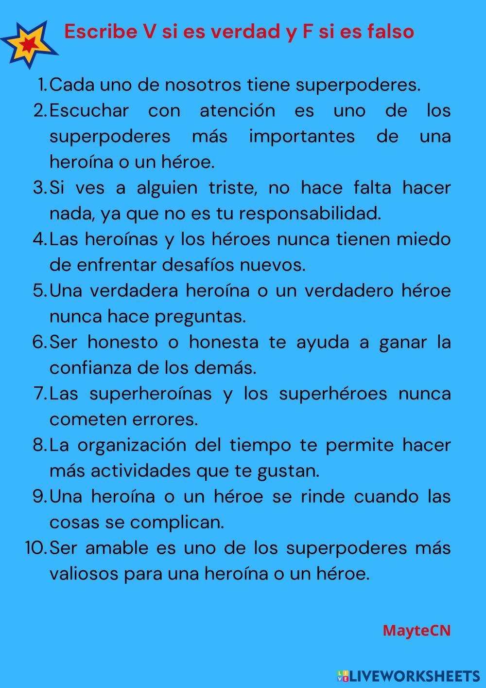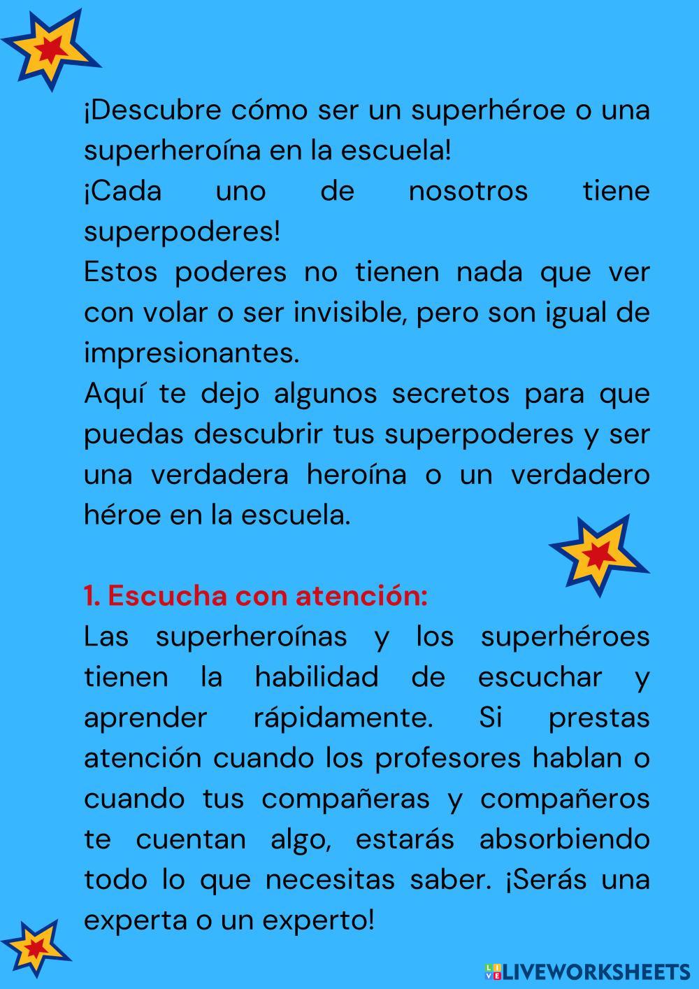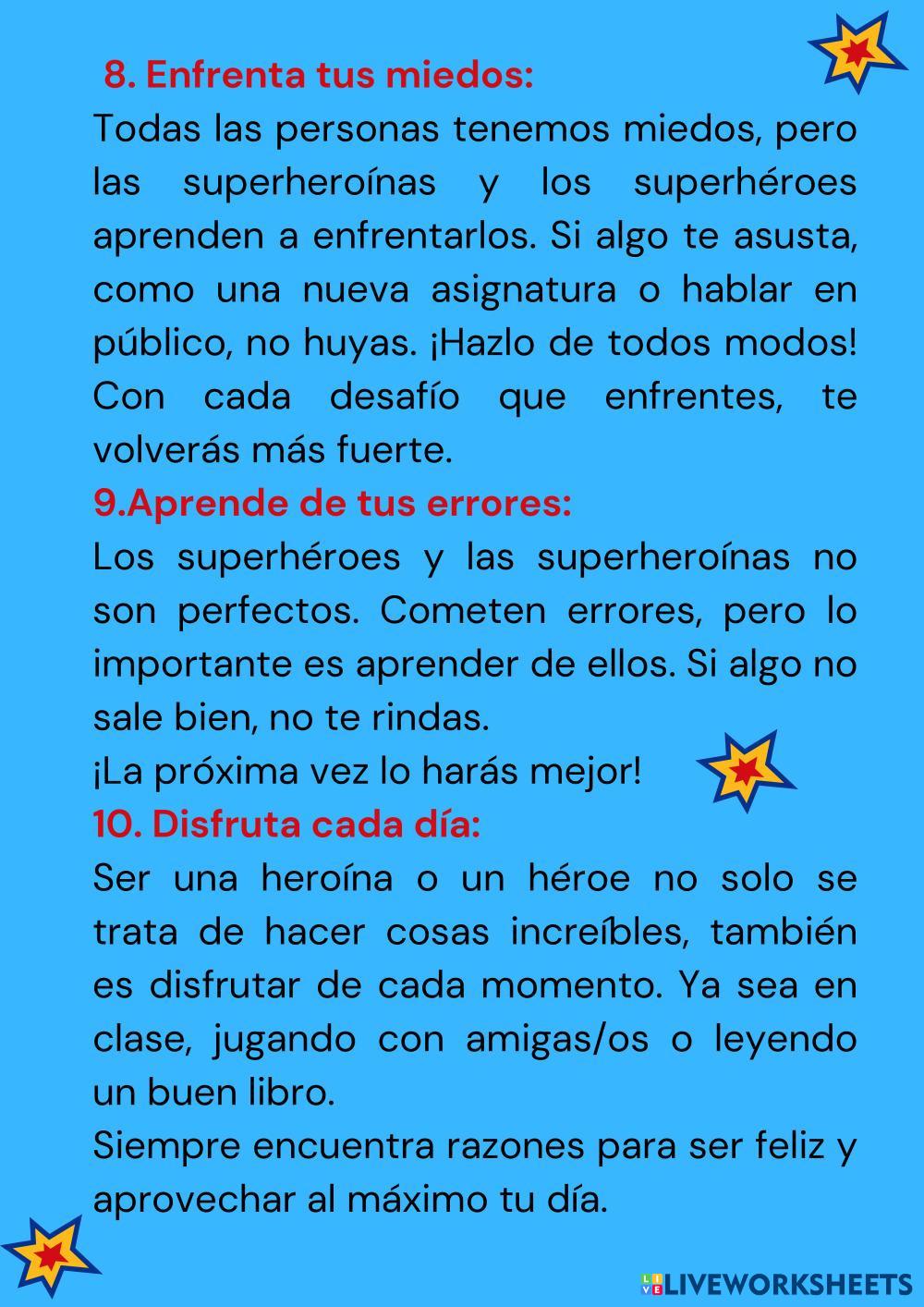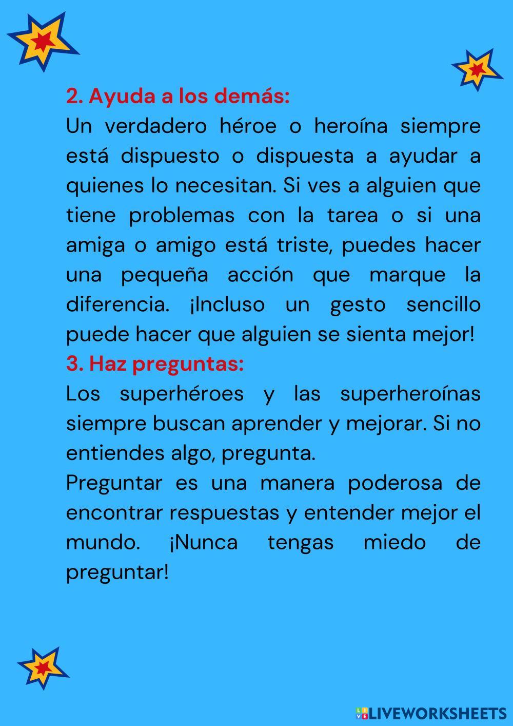 Created byLuz Mayte Correa Nazco Educación emocional y Valores Autoestima. Escucha activa. Perseverancia Age 7-15 level: 3ª Spanish Author's Instructions My Google Classroom Courses × 0 classes selected (0 students total) Quick Access Select all classes (0 classes) All Classes Loading courses... Cancel Share Share to selected Course __COURSE_NAME__ __STUDENT_NAME__ (__STUDENT_EMAIL__) DESCUBRE CÓMO SER UN SUPERHÉROE O UNA SUPERHEROÍNA Download Worksheet Validation Check my answers Emails my answers to my teacher Full name Group/level School subject Teacher's email or key code Close Submit Validating worksheet... (12) Your answers have been sent to your teacher. Good luck! OK We encountered an error submitting your answers. Please try again. OK Advertisement | Go Ad Free Created byLuz Mayte Correa Nazco Educación emocional y Valores Autoestima. Escucha activa. Perseverancia Age 7-15 level: 3ª Spanish Author's Instructions