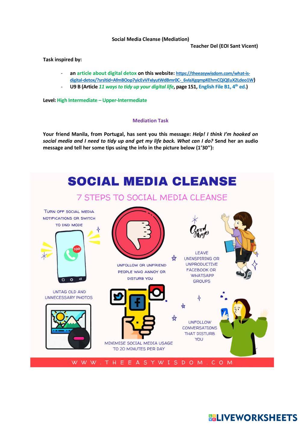 Created by Delilah EFL Mediation Age 16+ level: High Intermediate - Upper-Intermediate Spanish Author's Instructions Mediation. Vocab on social media My Google Classroom Courses × 0 classes selected (0 students total) Quick Access Select all classes (0 classes) All Classes Loading courses... Cancel Share Share to selected Course __COURSE_NAME__ __STUDENT_NAME__ (__STUDENT_EMAIL__) Mediation: Social Media Cleanse Download Worksheet Validation Check my answers Emails my answers to my teacher Full name Group/level School subject Teacher's email or key code Close Submit Validating worksheet... (12) Your answers have been sent to your teacher. Good luck! OK We encountered an error submitting your answers. Please try again. OK Advertisement | Go Ad Free Created by Delilah EFL Mediation Age 16+ level: High Intermediate - Upper-Intermediate Spanish Author's Instructions Mediation. Vocab on social media