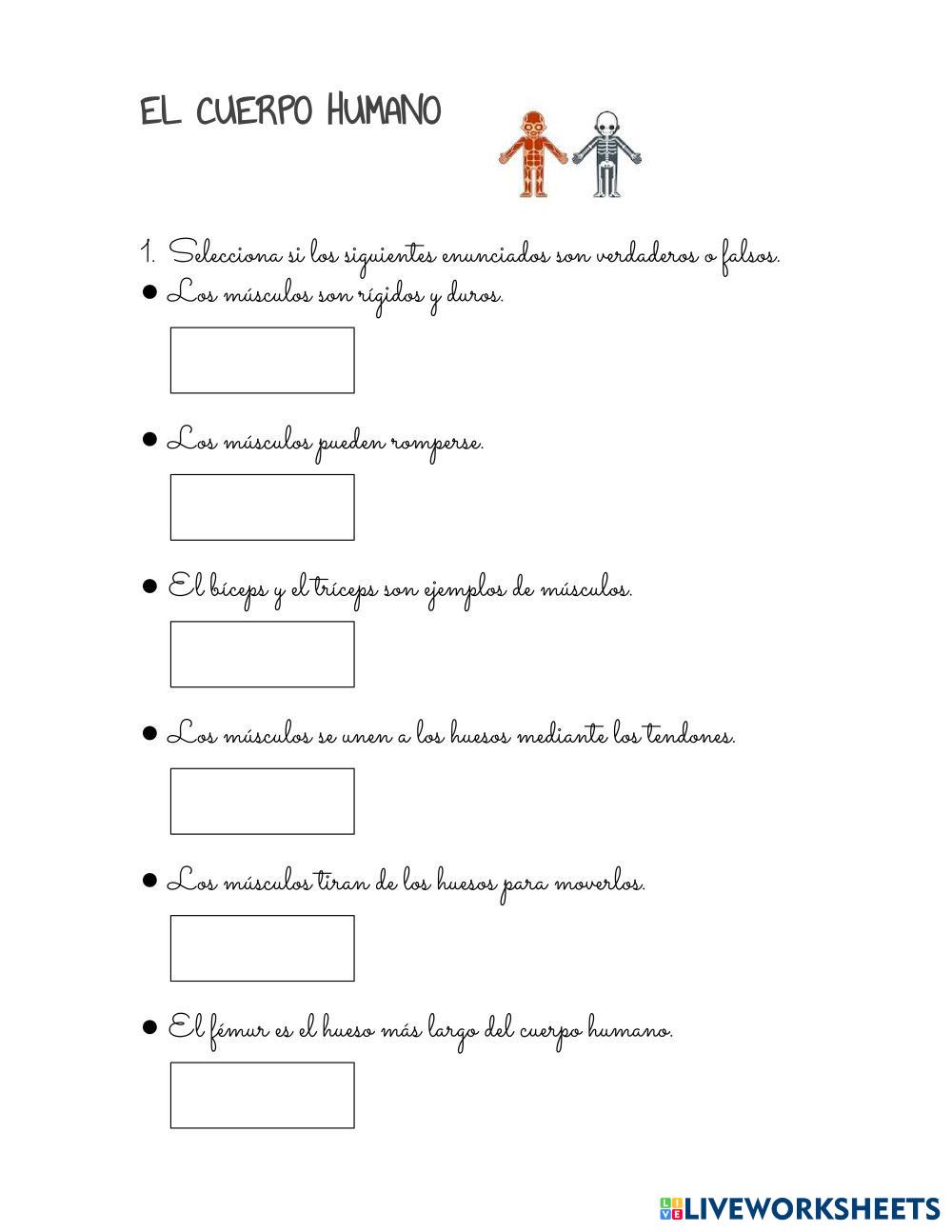 Created byLucía EL CUERPO HUMANO Huesos, músculos y articulaciones Age 10-15 level: 5° Ed. Primaria Spanish Author's Instructions Cuadro de verdadero y falso. My Google Classroom Courses × 0 classes selected (0 students total) Quick Access Select all classes (0 classes) All Classes Loading courses... Cancel Share Share to selected Course __COURSE_NAME__ __STUDENT_NAME__ (__STUDENT_EMAIL__) El cuerpo humano Download Worksheet Validation Check my answers Emails my answers to my teacher Full name Group/level School subject Teacher's email or key code Close Submit Validating worksheet... (12) Your answers have been sent to your teacher. Good luck! OK We encountered an error submitting your answers. Please try again. OK Advertisement | Go Ad Free Created byLucía EL CUERPO HUMANO Huesos, músculos y articulaciones Age 10-15 level: 5° Ed. Primaria Spanish Author's Instructions Cuadro de verdadero y falso.