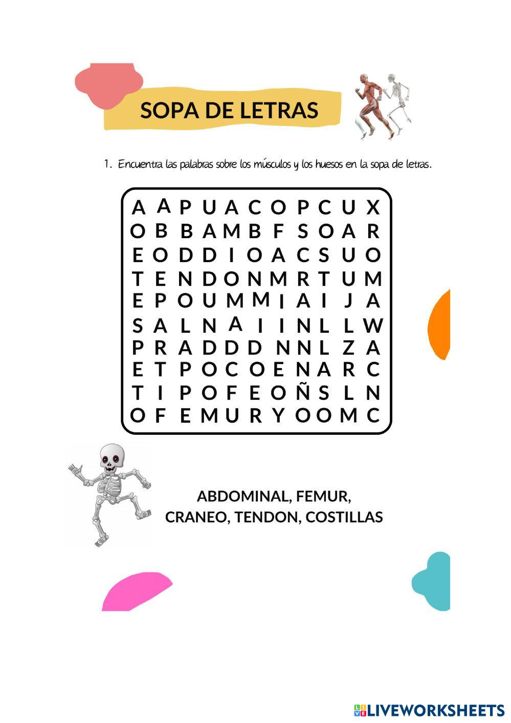 Created byLucía EL CUERPO HUMANO Huesos y músculos Age 10-14 level: 5° Ed. Primaria Spanish Author's Instructions My Google Classroom Courses × 0 classes selected (0 students total) Quick Access Select all classes (0 classes) All Classes Loading courses... Cancel Share Share to selected Course __COURSE_NAME__ __STUDENT_NAME__ (__STUDENT_EMAIL__) El cuerpo humano (sopa de letras) Download Worksheet Validation Check my answers Emails my answers to my teacher Full name Group/level School subject Teacher's email or key code Close Submit Validating worksheet... (12) Your answers have been sent to your teacher. Good luck! OK We encountered an error submitting your answers. Please try again. OK Advertisement | Go Ad Free Created byLucía EL CUERPO HUMANO Huesos y músculos Age 10-14 level: 5° Ed. Primaria Spanish Author's Instructions