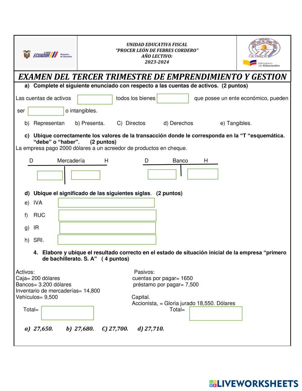 Created byLuis Nelson Serrano Suarez EMPRENDIMIENTO Y GESTIÓN examen Age 12+ level: 10 Spanish Author's Instructions My Google Classroom Courses × 0 classes selected (0 students total) Quick Access Select all classes (0 classes) All Classes Loading courses... Cancel Share Share to selected Course __COURSE_NAME__ __STUDENT_NAME__ (__STUDENT_EMAIL__) emprendimiento examen 1ro Download Worksheet Validation Check my answers Emails my answers to my teacher Full name Group/level School subject Teacher's email or key code Close Submit Validating worksheet... (12) Your answers have been sent to your teacher. Good luck! OK We encountered an error submitting your answers. Please try again. OK Advertisement | Go Ad Free Created byLuis Nelson Serrano Suarez EMPRENDIMIENTO Y GESTIÓN examen Age 12+ level: 10 Spanish Author's Instructions