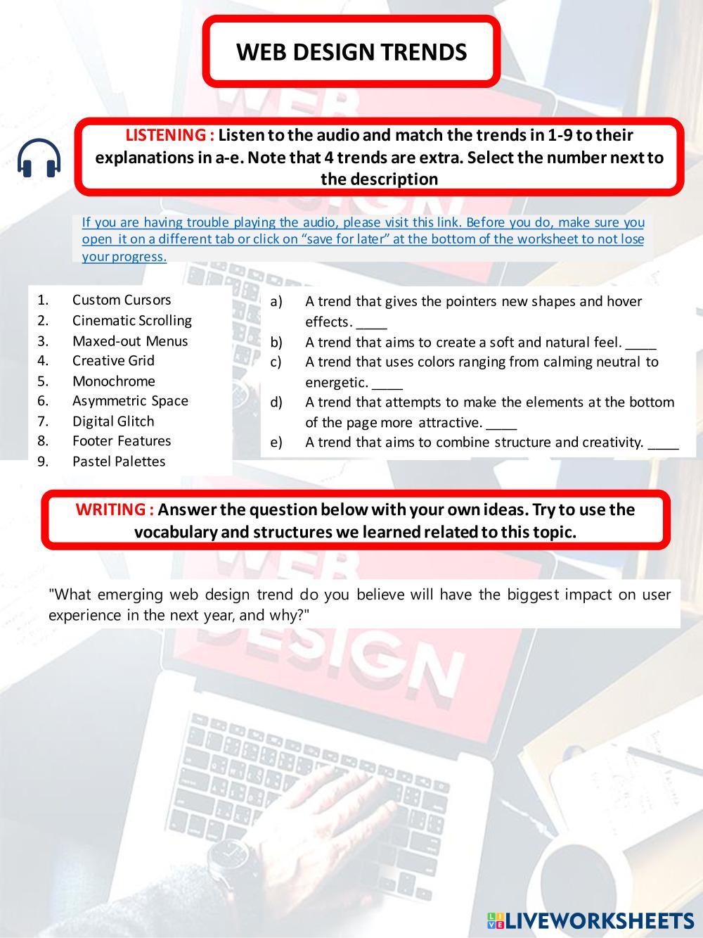 Worksheet to work on the topic related to web design trends.