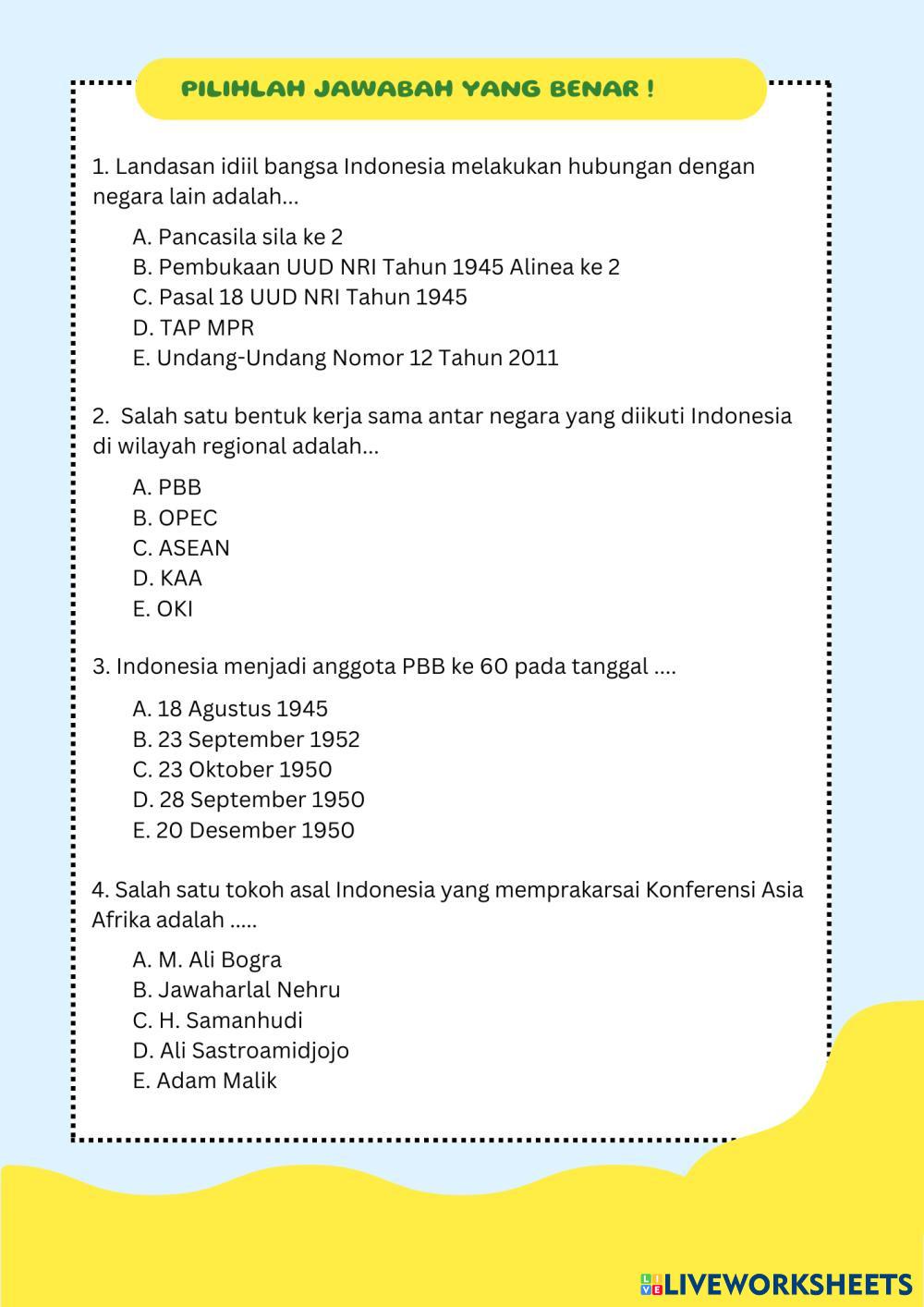 Created bytifani Pendidikan Pancasila dan Kewarganegaraan (PPKn) Peran Indonesia dalam hubungan internasional Age 16+ level: SMA KELAS X Indonesian Author's Instructions My Google Classroom Courses × 0 classes selected (0 students total) Quick Access Select all classes (0 classes) All Classes Loading courses... Cancel Share Share to selected Course __COURSE_NAME__ __STUDENT_NAME__ (__STUDENT_EMAIL__) LKPD Download Worksheet Validation Check my answers Emails my answers to my teacher Full name Group/level School subject Teacher's email or key code Close Submit Validating worksheet... (12) Your answers have been sent to your teacher. Good luck! OK We encountered an error submitting your answers. Please try again. OK Advertisement | Go Ad Free Created bytifani Pendidikan Pancasila dan Kewarganegaraan (PPKn) Peran Indonesia dalam hubungan internasional Age 16+ level: SMA KELAS X Indonesian Author's Instructions