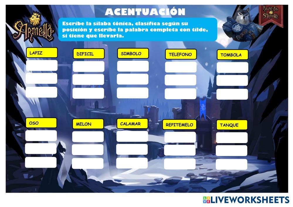 Created by KMG10 English Language Elementary 5th grade Grammar Spanish Author's Instructions LENGUA/T3-ACENTUACIÓN 1 My Google Classroom Courses × 0 classes selected (0 students total) Quick Access Select all classes (0 classes) All Classes Loading courses... Cancel Share Share to selected Course __COURSE_NAME__ __STUDENT_NAME__ (__STUDENT_EMAIL__) LENGUA/T3-ACENTUACIÓN 1 Download Worksheet Validation Check my answers Emails my answers to my teacher Full name Group/level School subject Teacher's email or key code Close Submit Validating worksheet... (12) Your answers have been sent to your teacher. Good luck! OK We encountered an error submitting your answers. Please try again. OK Advertisement | Go Ad Free Created by KMG10 English Language Elementary 5th grade Grammar Spanish Author's Instructions LENGUA/T3-ACENTUACIÓN 1 Explore Worksheets Use of English Final Exam - Teens 5 English Language 5th grade Use of English Final Exam - Teens 5 Grammar - English Language COMPLETE THE WORKSHEET Сan/can't English Language 5th grade Сan/can't Grammar - English Language Good luck! can/can't English Language 5th grade can/can't Grammar - English Language I wish you luck! Rodzajnik określony/nieokreślony English Language 5th grade Rodzajnik określony/nieokreślony Grammar - English Language Mach Ubungen
