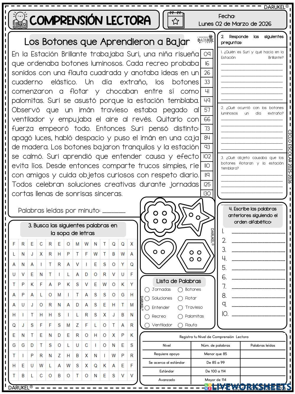 Created by karlarosasgallardo English Language Elementary 4th grade Reading Comprehension Spanish Author's Instructions RESUELVE My Google Classroom Courses × 0 classes selected (0 students total) Quick Access Select all classes (0 classes) All Classes Loading courses... Cancel Share Share to selected Course __COURSE_NAME__ __STUDENT_NAME__ (__STUDENT_EMAIL__) LECTURA 30 MARZO Download Worksheet Validation Check my answers Emails my answers to my teacher Full name Group/level School subject Teacher's email or key code Close Submit Validating worksheet... (12) Your answers have been sent to your teacher. Good luck! OK We encountered an error submitting your answers. Please try again. OK Advertisement | Go Ad Free Created by karlarosasgallardo English Language Elementary 4th grade Reading Comprehension Spanish Author's Instructions RESUELVE Explore Worksheets Él árbitro de fútbol: Comprensión lectora English Language 4th grade Él árbitro de fútbol: Comprensión lectora Reading Comprehension - English Language Esta ficha de comprensión lectora para cuarto grado ayuda a tus alumnos a aprender sobre la labor de un árbitro de fútbol. LECTURA 31 MARZO English Language 4th grade LECTURA 31 MARZO Reading Comprehension - English Language RESUELVE Reading Comprehension English Language 4th grade Reading Comprehension Reading Comprehension - English Language Read the text. Read the sentences and write 'yes' or 'no'. Year 5 Reading comprehension English Language 4th grade Year 5 Reading comprehension Reading Comprehension - English Language Read the passage carefully before answering the questions.
