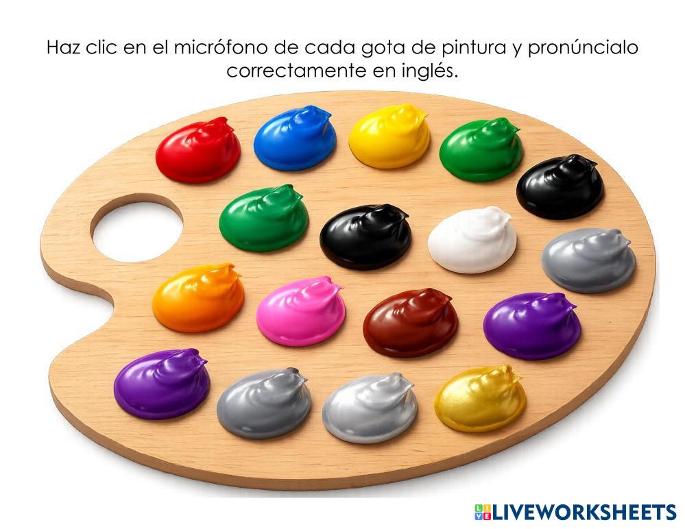 Haz clic en el micrófono sobre la gota de pintura y pronuncia correctamente el nombre del color en inglés.