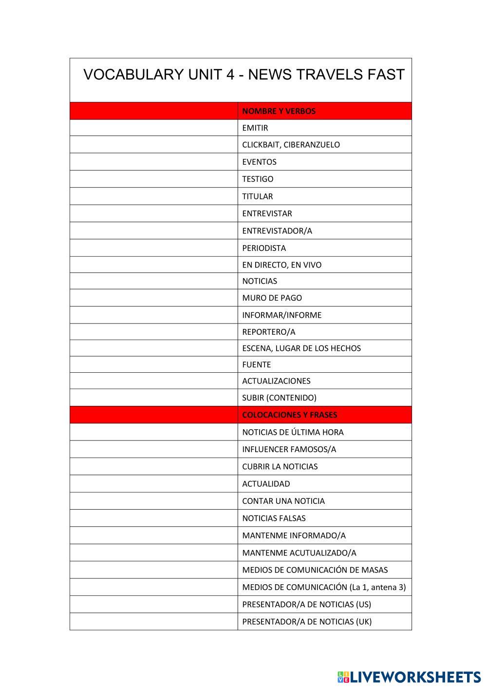 UNIT 4 - ACTIVIDADES SOBRE EL VOCABULARIO 4