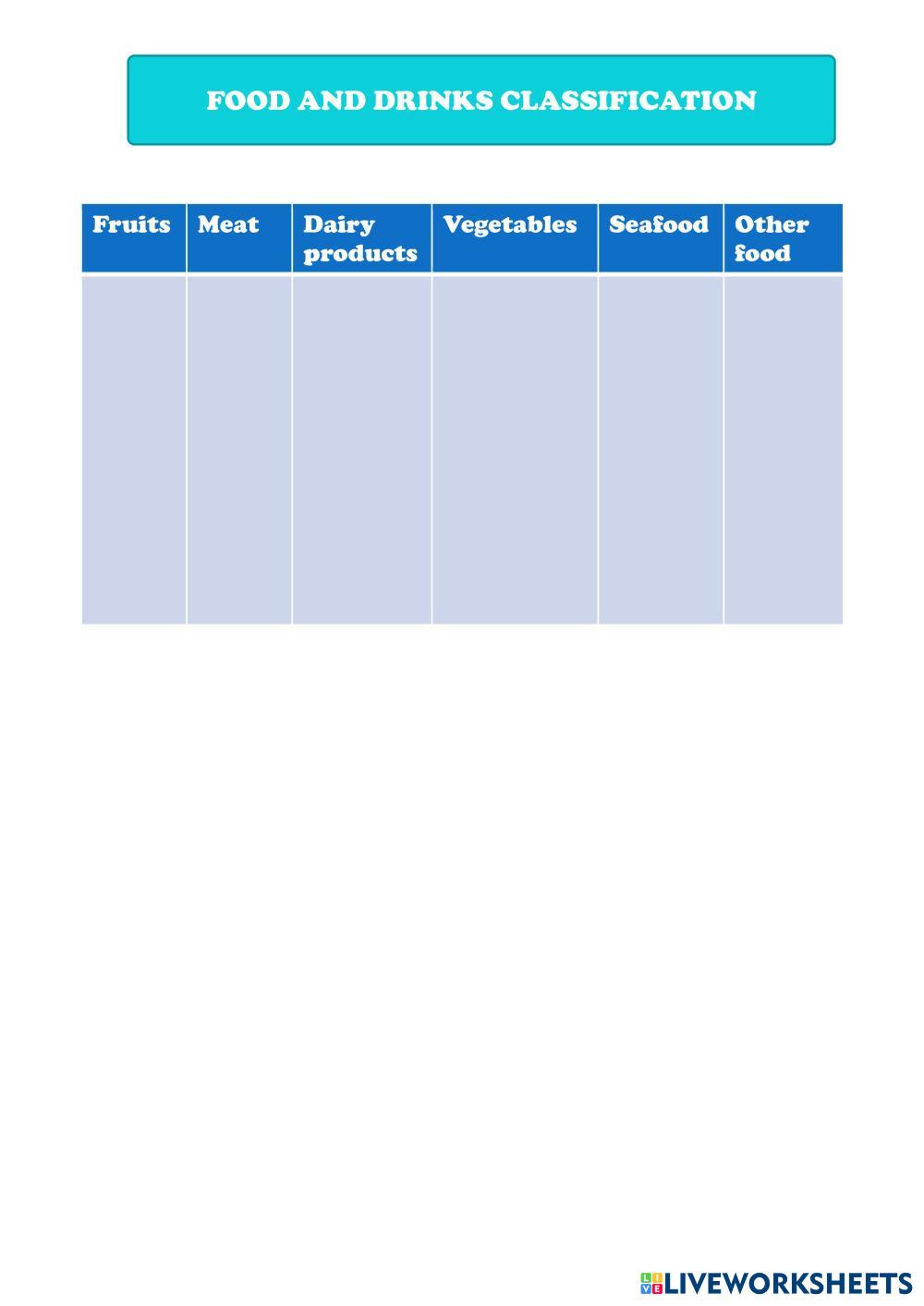Vocabulary and classification of food according with its type: dairy products, vegetables, fruits, etc