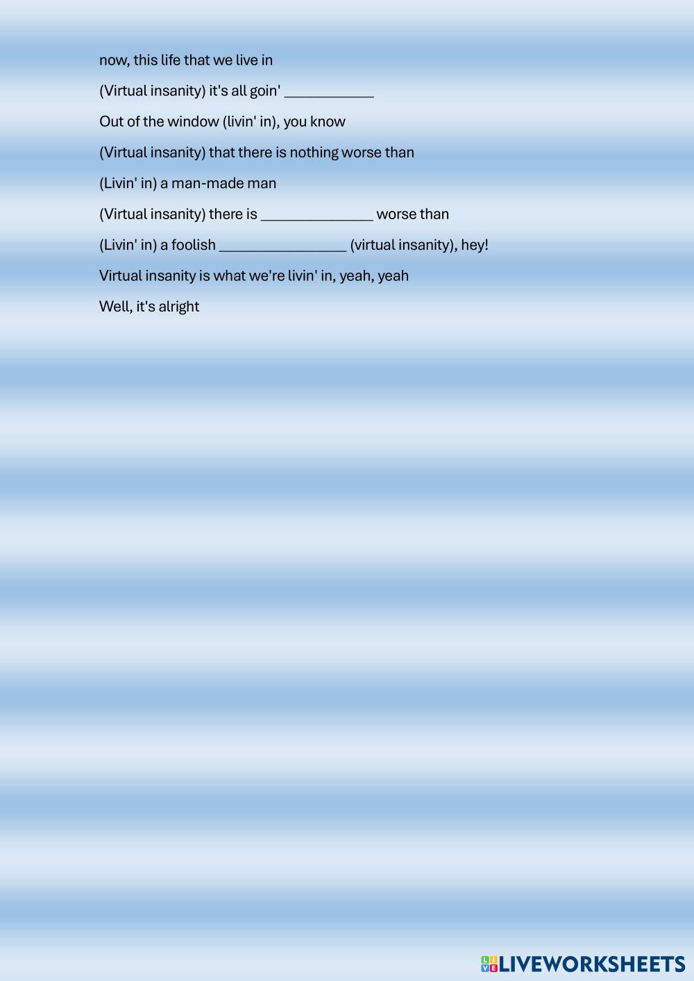 Created by Braulia89 English as a Second Language (ESL) Lyrics Age 10-16 level: 5º - 6º Spanish Author's Instructions My Google Classroom Courses × 0 classes selected (0 students total) Quick Access Select all classes (0 classes) All Classes Loading courses... Cancel Share Share to selected Course __COURSE_NAME__ __STUDENT_NAME__ (__STUDENT_EMAIL__) Virtual Insanity by Jamiroquai Download Worksheet Validation Check my answers Emails my answers to my teacher Full name Group/level School subject Teacher's email or key code Close Submit Validating worksheet... (12) Your answers have been sent to your teacher. Good luck! OK We encountered an error submitting your answers. Please try again. OK Advertisement | Go Ad Free Created by Braulia89 English as a Second Language (ESL) Lyrics Age 10-16 level: 5º - 6º Spanish Author's Instructions