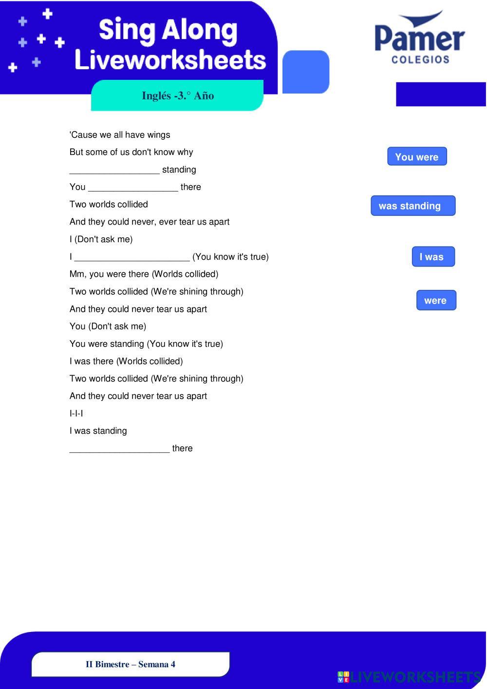 Created by 12pa English as a Second Language (ESL) Past Continuous Tense Age 12+ level: SECONDARY Spanish Author's Instructions My Google Classroom Courses × 0 classes selected (0 students total) Quick Access Select all classes (0 classes) All Classes Loading courses... Cancel Share Share to selected Course __COURSE_NAME__ __STUDENT_NAME__ (__STUDENT_EMAIL__) ENGLISH SONG - NEVER TEARS US APART Download Worksheet Validation Check my answers Emails my answers to my teacher Full name Group/level School subject Teacher's email or key code Close Submit Validating worksheet... (12) Your answers have been sent to your teacher. Good luck! OK We encountered an error submitting your answers. Please try again. OK Advertisement | Go Ad Free Created by 12pa English as a Second Language (ESL) Past Continuous Tense Age 12+ level: SECONDARY Spanish Author's Instructions
