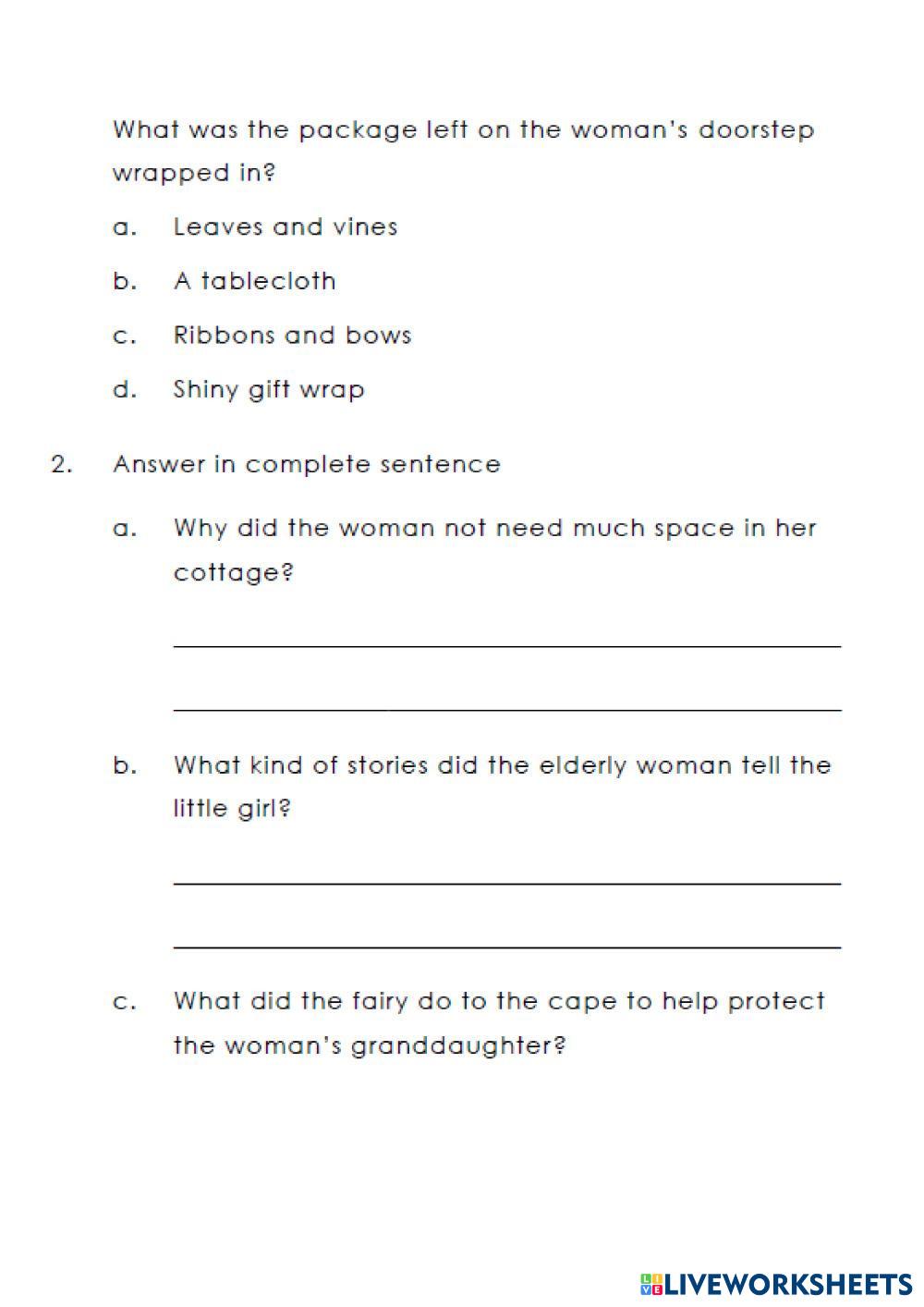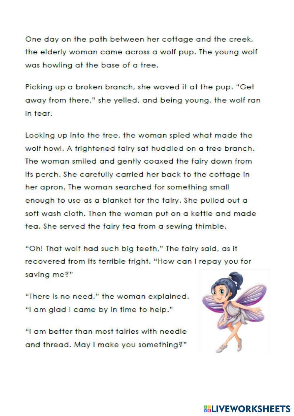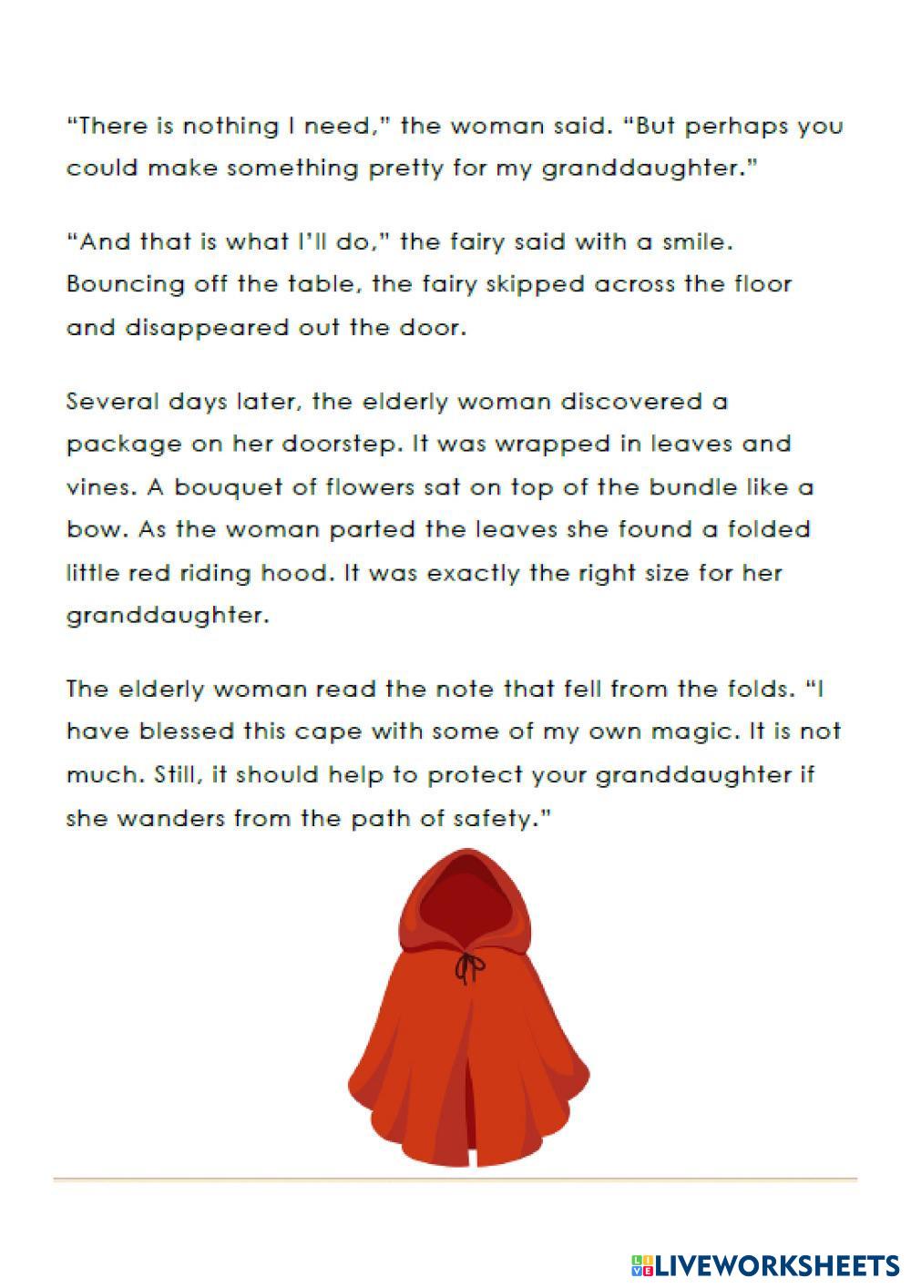 Created by melin123 English as a Second Language (ESL) Reading comprehension Age 9-15 level: A2 Spanish Author's Instructions My Google Classroom Courses × 0 classes selected (0 students total) Quick Access Select all classes (0 classes) All Classes Loading courses... Cancel Share Share to selected Course __COURSE_NAME__ __STUDENT_NAME__ (__STUDENT_EMAIL__) Reading: The little red cape Download Worksheet Validation Check my answers Emails my answers to my teacher Full name Group/level School subject Teacher's email or key code Close Submit Validating worksheet... (12) Your answers have been sent to your teacher. Good luck! OK We encountered an error submitting your answers. Please try again. OK Advertisement | Go Ad Free Created by melin123 English as a Second Language (ESL) Reading comprehension Age 9-15 level: A2 Spanish Author's Instructions