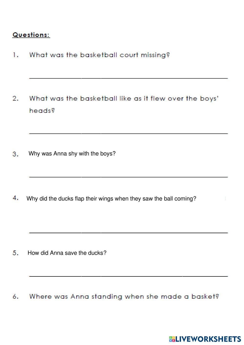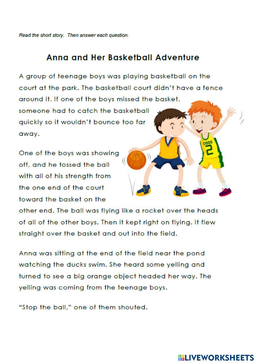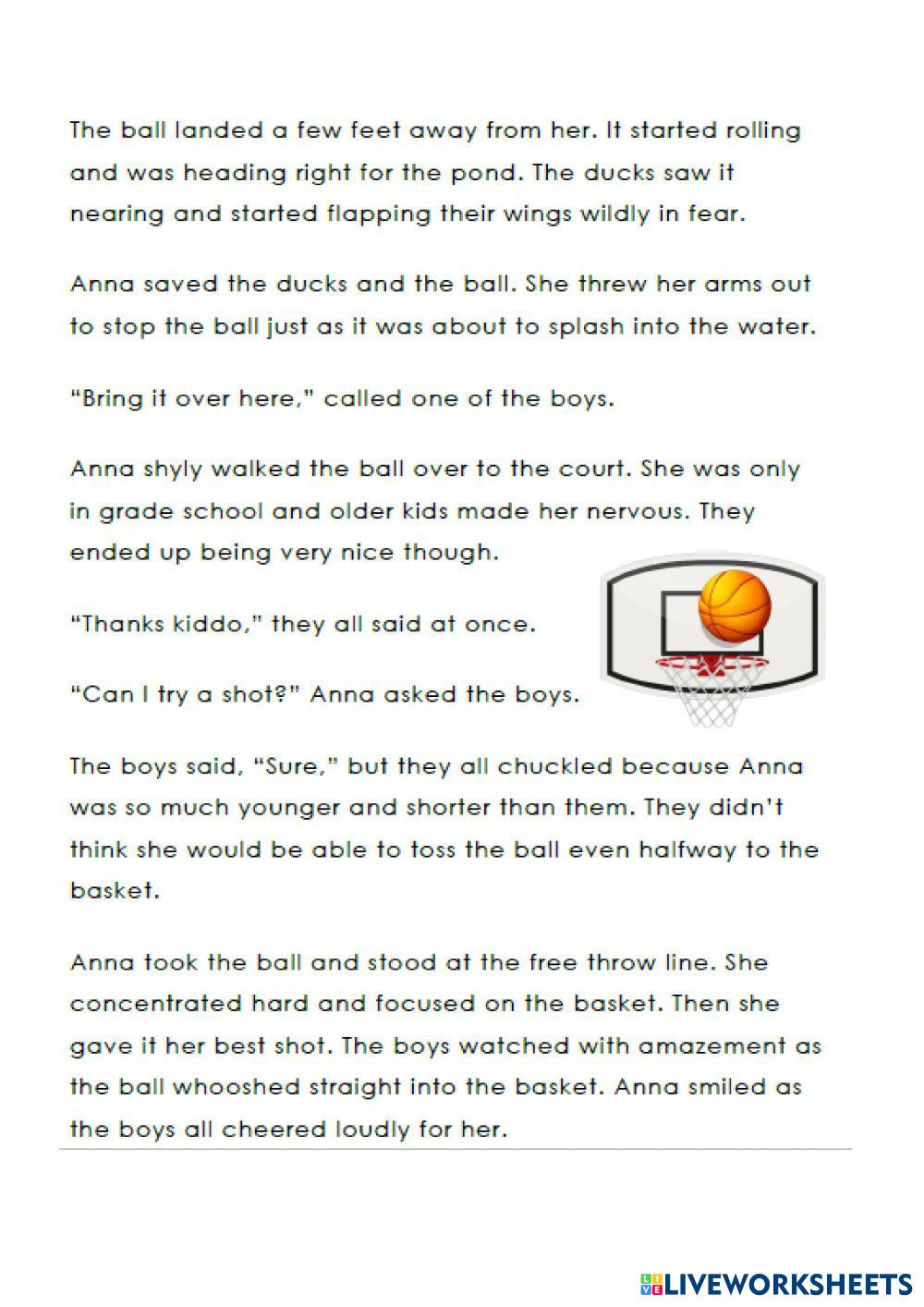 Created by melin123 English as a Second Language (ESL) Reading comprehension Age 9-15 level: A2 Spanish Author's Instructions My Google Classroom Courses × 0 classes selected (0 students total) Quick Access Select all classes (0 classes) All Classes Loading courses... Cancel Share Share to selected Course __COURSE_NAME__ __STUDENT_NAME__ (__STUDENT_EMAIL__) Reading: Anna and her basketball adventure Download Worksheet Validation Check my answers Emails my answers to my teacher Full name Group/level School subject Teacher's email or key code Close Submit Validating worksheet... (12) Your answers have been sent to your teacher. Good luck! OK We encountered an error submitting your answers. Please try again. OK Advertisement | Go Ad Free Created by melin123 English as a Second Language (ESL) Reading comprehension Age 9-15 level: A2 Spanish Author's Instructions