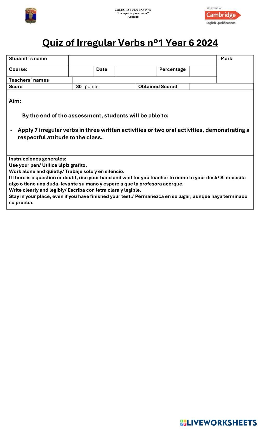Created by panchotg English as a Second Language (ESL) Irregular verbs Age 11-15 level: Pre A1 Spanish Author's Instructions My Google Classroom Courses × 0 classes selected (0 students total) Quick Access Select all classes (0 classes) All Classes Loading courses... Cancel Share Share to selected Course __COURSE_NAME__ __STUDENT_NAME__ (__STUDENT_EMAIL__) Quiz of Irregular verbs Year 6 nº1 Download Worksheet Validation Check my answers Emails my answers to my teacher Full name Group/level School subject Teacher's email or key code Close Submit Validating worksheet... (12) Your answers have been sent to your teacher. Good luck! OK We encountered an error submitting your answers. Please try again. OK Advertisement | Go Ad Free Created by panchotg English as a Second Language (ESL) Irregular verbs Age 11-15 level: Pre A1 Spanish Author's Instructions