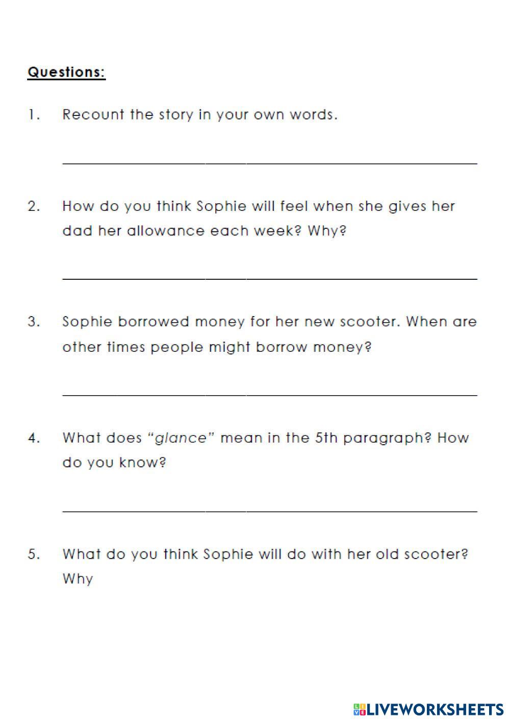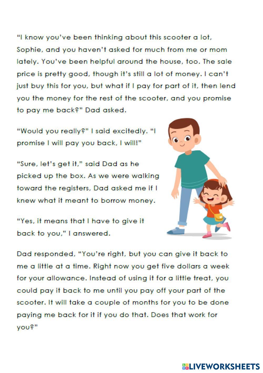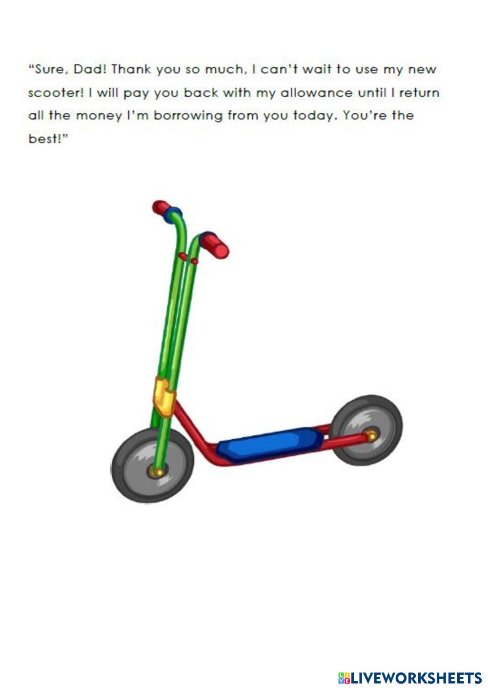 Created by melin123 English as a Second Language (ESL) Reading comprehension Age 10-15 level: key for school Spanish Author's Instructions My Google Classroom Courses × 0 classes selected (0 students total) Quick Access Select all classes (0 classes) All Classes Loading courses... Cancel Share Share to selected Course __COURSE_NAME__ __STUDENT_NAME__ (__STUDENT_EMAIL__) My new scooter Download Worksheet Validation Check my answers Emails my answers to my teacher Full name Group/level School subject Teacher's email or key code Close Submit Validating worksheet... (12) Your answers have been sent to your teacher. Good luck! OK We encountered an error submitting your answers. Please try again. OK Advertisement | Go Ad Free Created by melin123 English as a Second Language (ESL) Reading comprehension Age 10-15 level: key for school Spanish Author's Instructions