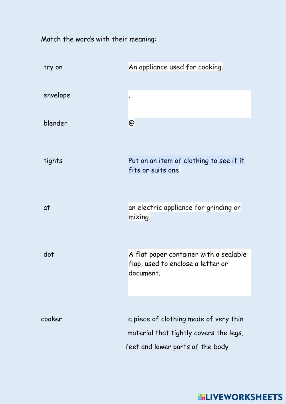 Created by melin123 English as a Second Language (ESL) Vocabulary Age 10-15 level: A2 key for school Spanish Author's Instructions My Google Classroom Courses × 0 classes selected (0 students total) Quick Access Select all classes (0 classes) All Classes Loading courses... Cancel Share Share to selected Course __COURSE_NAME__ __STUDENT_NAME__ (__STUDENT_EMAIL__) A2 Key for school vocabulary 1 Download Worksheet Validation Check my answers Emails my answers to my teacher Full name Group/level School subject Teacher's email or key code Close Submit Validating worksheet... (12) Your answers have been sent to your teacher. Good luck! OK We encountered an error submitting your answers. Please try again. OK Advertisement | Go Ad Free Created by melin123 English as a Second Language (ESL) Vocabulary Age 10-15 level: A2 key for school Spanish Author's Instructions