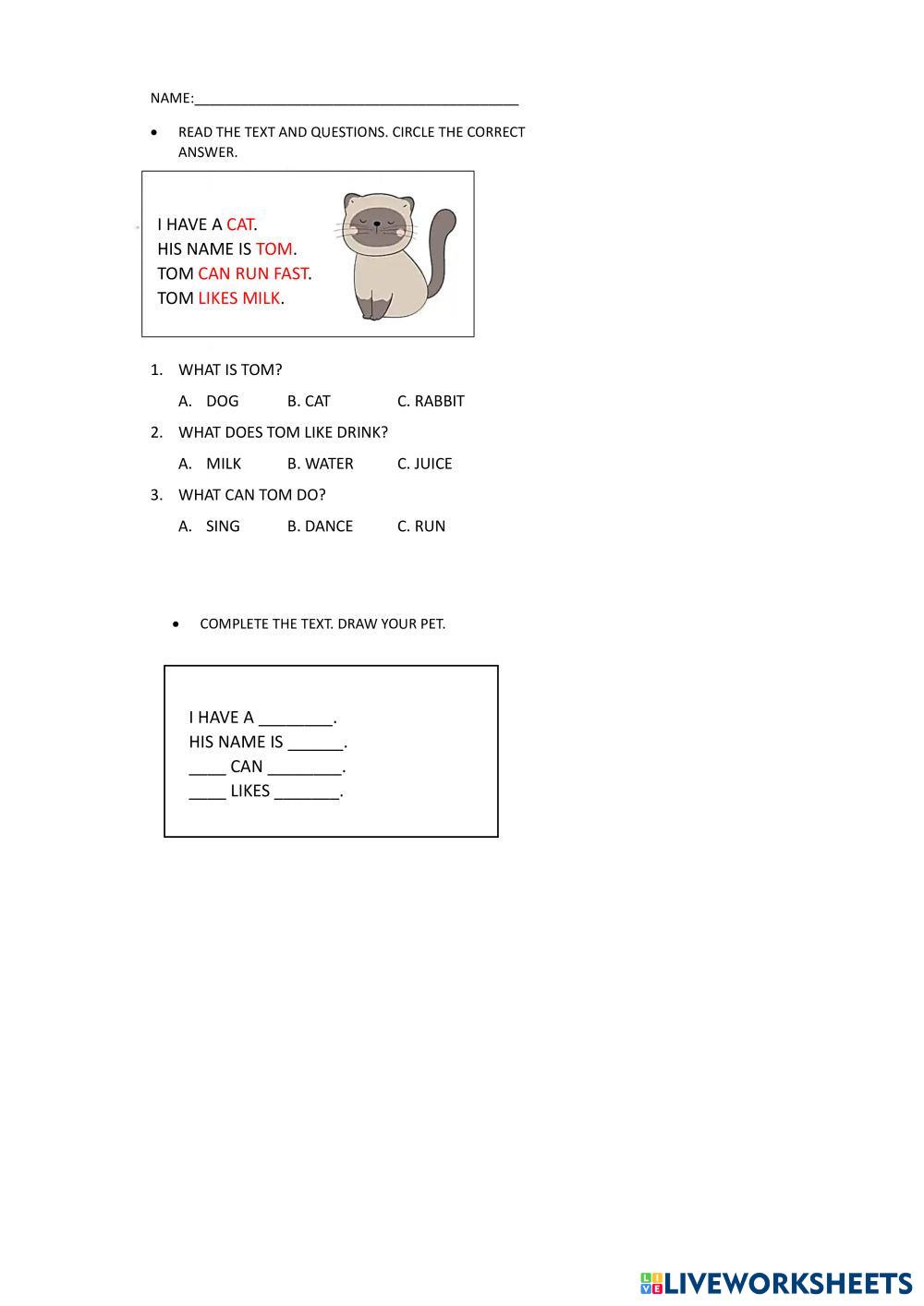 Created by flori096 English as a Second Language (ESL) Reading comprehension Age 7-11 level: PRE JUNIOR Spanish Author's Instructions My Google Classroom Courses × 0 classes selected (0 students total) Quick Access Select all classes (0 classes) All Classes Loading courses... Cancel Share Share to selected Course __COURSE_NAME__ __STUDENT_NAME__ (__STUDENT_EMAIL__) CAN/LIKES Download Worksheet Validation Check my answers Emails my answers to my teacher Full name Group/level School subject Teacher's email or key code Close Submit Validating worksheet... (12) Your answers have been sent to your teacher. Good luck! OK We encountered an error submitting your answers. Please try again. OK Advertisement | Go Ad Free Created by flori096 English as a Second Language (ESL) Reading comprehension Age 7-11 level: PRE JUNIOR Spanish Author's Instructions