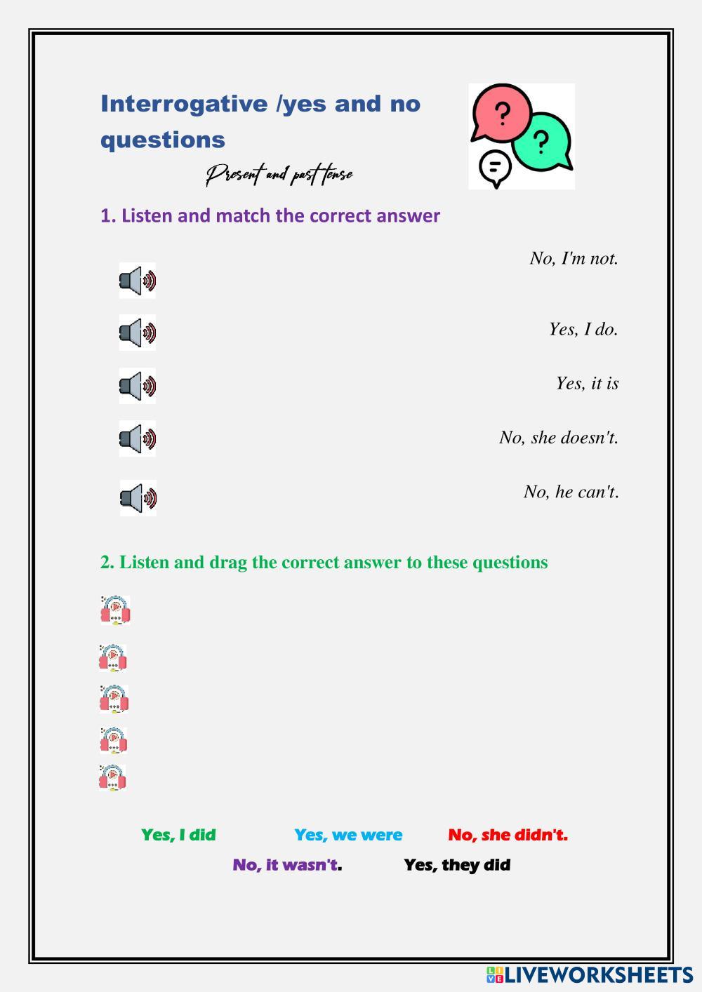 Created byRosa Angulo English as a Second Language (ESL) Interrogative sentences Age 8+ level: A2 Spanish Author's Instructions Listen and match the correct answer.Interrogative/ yes no questions. My Google Classroom Courses × 0 classes selected (0 students total) Quick Access Select all classes (0 classes) All Classes Loading courses... Cancel Share Share to selected Course __COURSE_NAME__ __STUDENT_NAME__ (__STUDENT_EMAIL__) Interrogative /yes no questions Download Worksheet Validation Check my answers Emails my answers to my teacher Full name Group/level School subject Teacher's email or key code Close Submit Validating worksheet... (12) Your answers have been sent to your teacher. Good luck! OK We encountered an error submitting your answers. Please try again. OK Advertisement | Go Ad Free Created byRosa Angulo English as a Second Language (ESL) Interrogative sentences Age 8+ level: A2 Spanish Author's Instructions Listen and match the correct answer.Interrogative/ yes no questions.