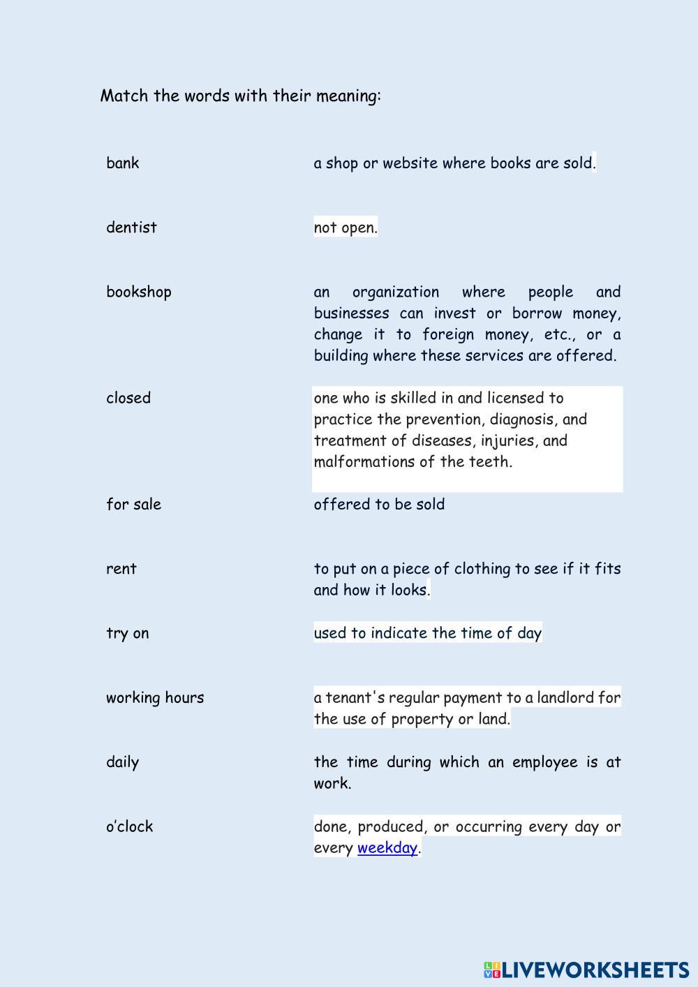 Created by melin123 English as a Second Language (ESL) Reading comprehension Age 10-16 level: A2 Key for school Spanish Author's Instructions My Google Classroom Courses × 0 classes selected (0 students total) Quick Access Select all classes (0 classes) All Classes Loading courses... Cancel Share Share to selected Course __COURSE_NAME__ __STUDENT_NAME__ (__STUDENT_EMAIL__) A2 Key for school Vocabulary 9 Download Worksheet Validation Check my answers Emails my answers to my teacher Full name Group/level School subject Teacher's email or key code Close Submit Validating worksheet... (12) Your answers have been sent to your teacher. Good luck! OK We encountered an error submitting your answers. Please try again. OK Advertisement | Go Ad Free Created by melin123 English as a Second Language (ESL) Reading comprehension Age 10-16 level: A2 Key for school Spanish Author's Instructions