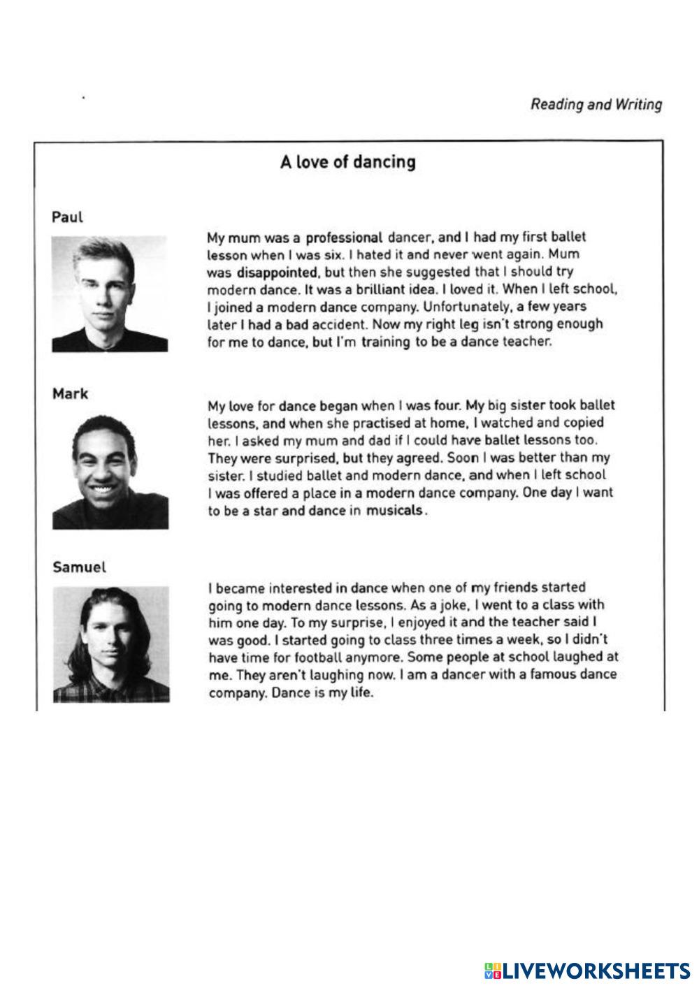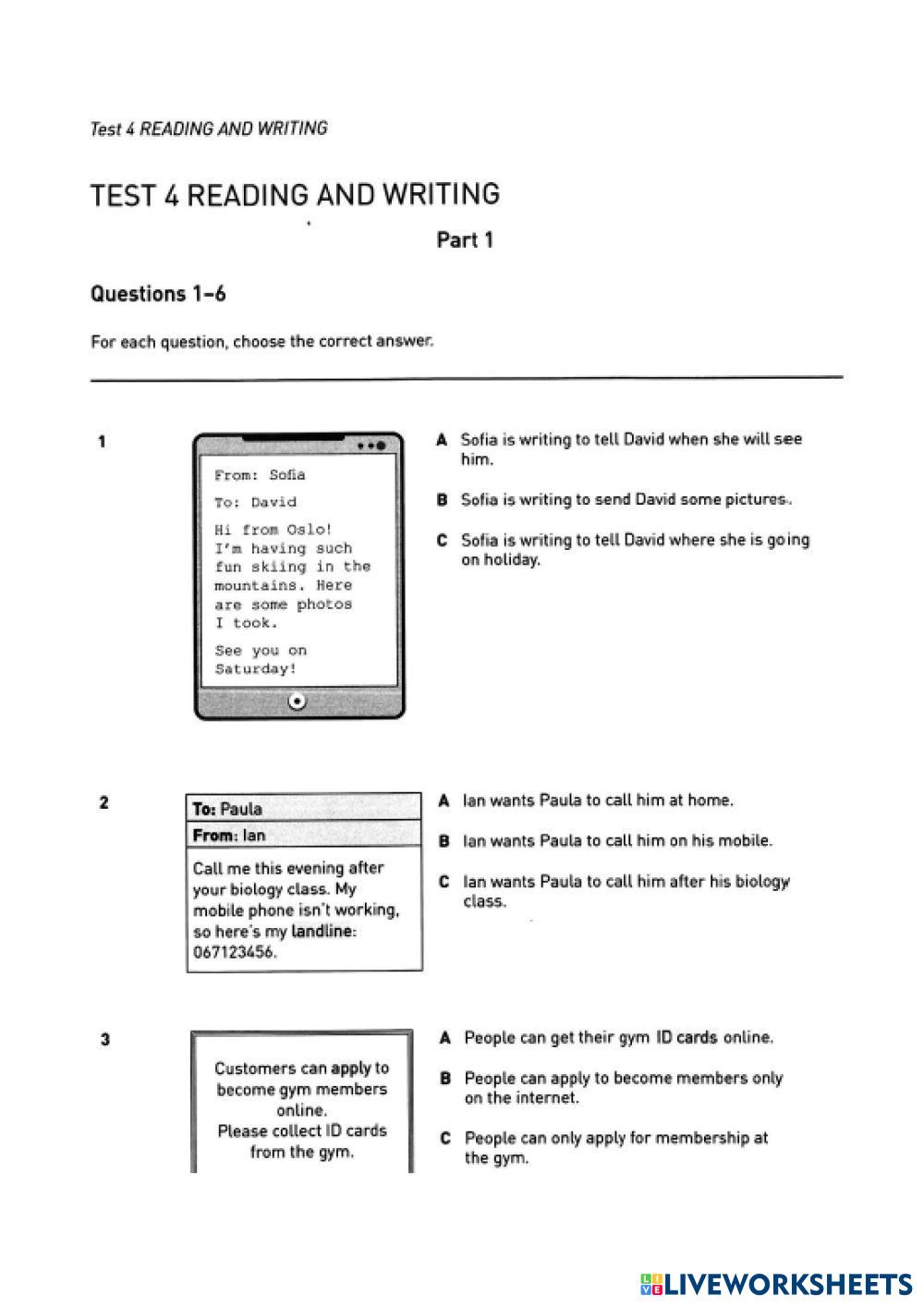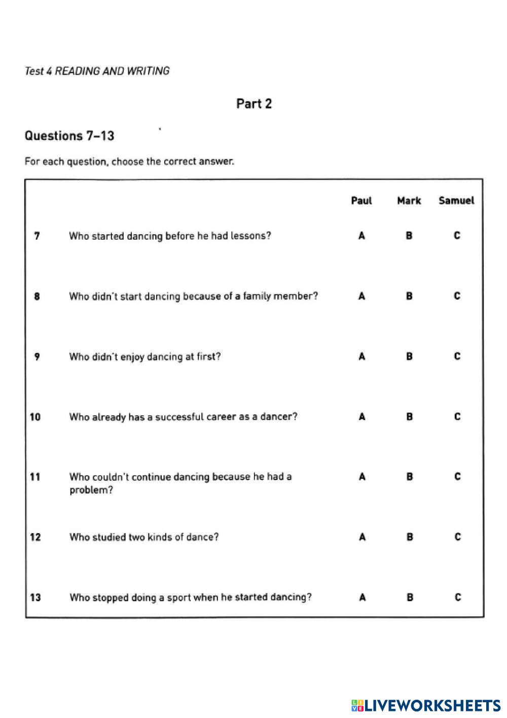 Created by melin123 English as a Second Language (ESL) READING AND WRITING Age 10-16 level: A2 Key for school Spanish Author's Instructions My Google Classroom Courses × 0 classes selected (0 students total) Quick Access Select all classes (0 classes) All Classes Loading courses... Cancel Share Share to selected Course __COURSE_NAME__ __STUDENT_NAME__ (__STUDENT_EMAIL__) A2 Key for school Test 2 Part 2 Download Worksheet Validation Check my answers Emails my answers to my teacher Full name Group/level School subject Teacher's email or key code Close Submit Validating worksheet... (12) Your answers have been sent to your teacher. Good luck! OK We encountered an error submitting your answers. Please try again. OK Advertisement | Go Ad Free Created by melin123 English as a Second Language (ESL) READING AND WRITING Age 10-16 level: A2 Key for school Spanish Author's Instructions