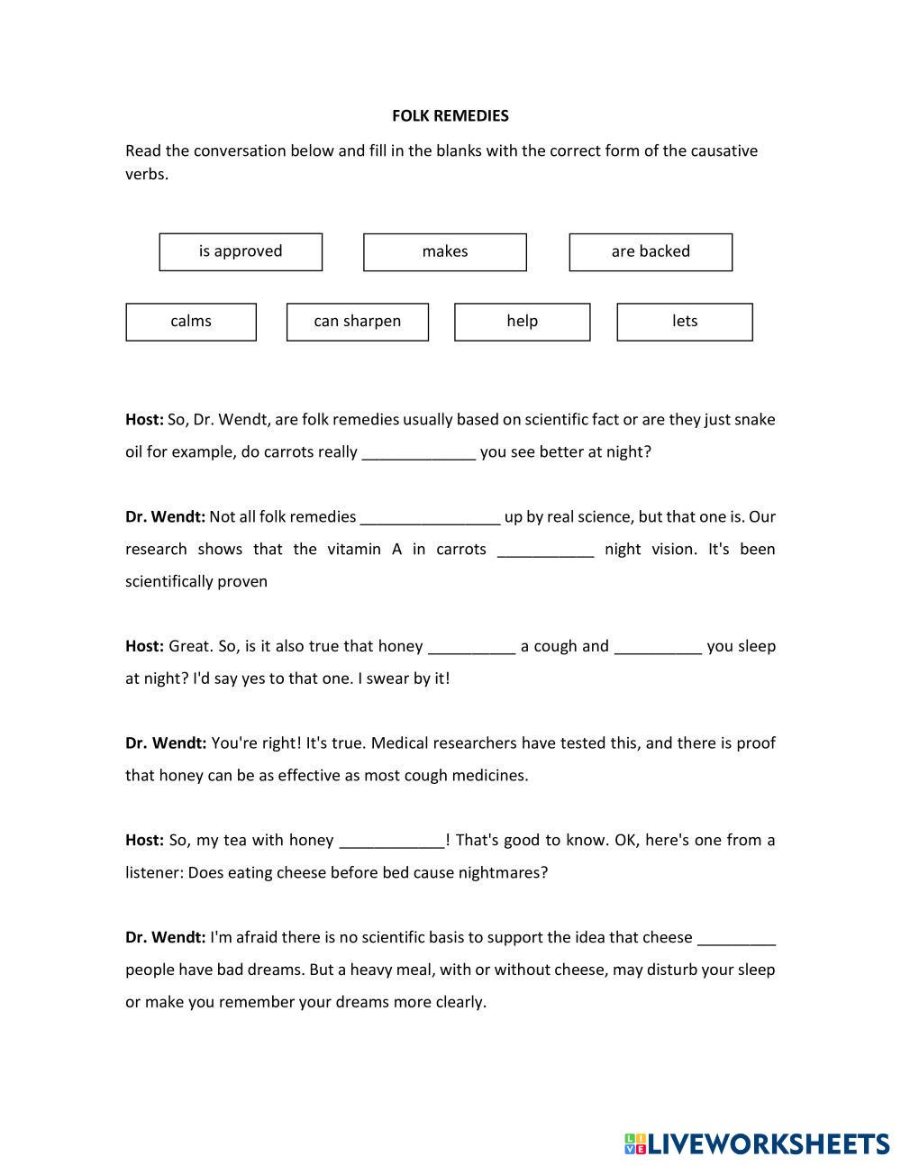 Created byGeoconda Valencia Cuesta English as a Second Language (ESL) Causative Verbs Age 10+ level: University Spanish Author's Instructions My Google Classroom Courses × 0 classes selected (0 students total) Quick Access Select all classes (0 classes) All Classes Loading courses... Cancel Share Share to selected Course __COURSE_NAME__ __STUDENT_NAME__ (__STUDENT_EMAIL__) Causative verbs Download Worksheet Validation Check my answers Emails my answers to my teacher Full name Group/level School subject Teacher's email or key code Close Submit Validating worksheet... (12) Your answers have been sent to your teacher. Good luck! OK We encountered an error submitting your answers. Please try again. OK Advertisement | Go Ad Free Created byGeoconda Valencia Cuesta English as a Second Language (ESL) Causative Verbs Age 10+ level: University Spanish Author's Instructions